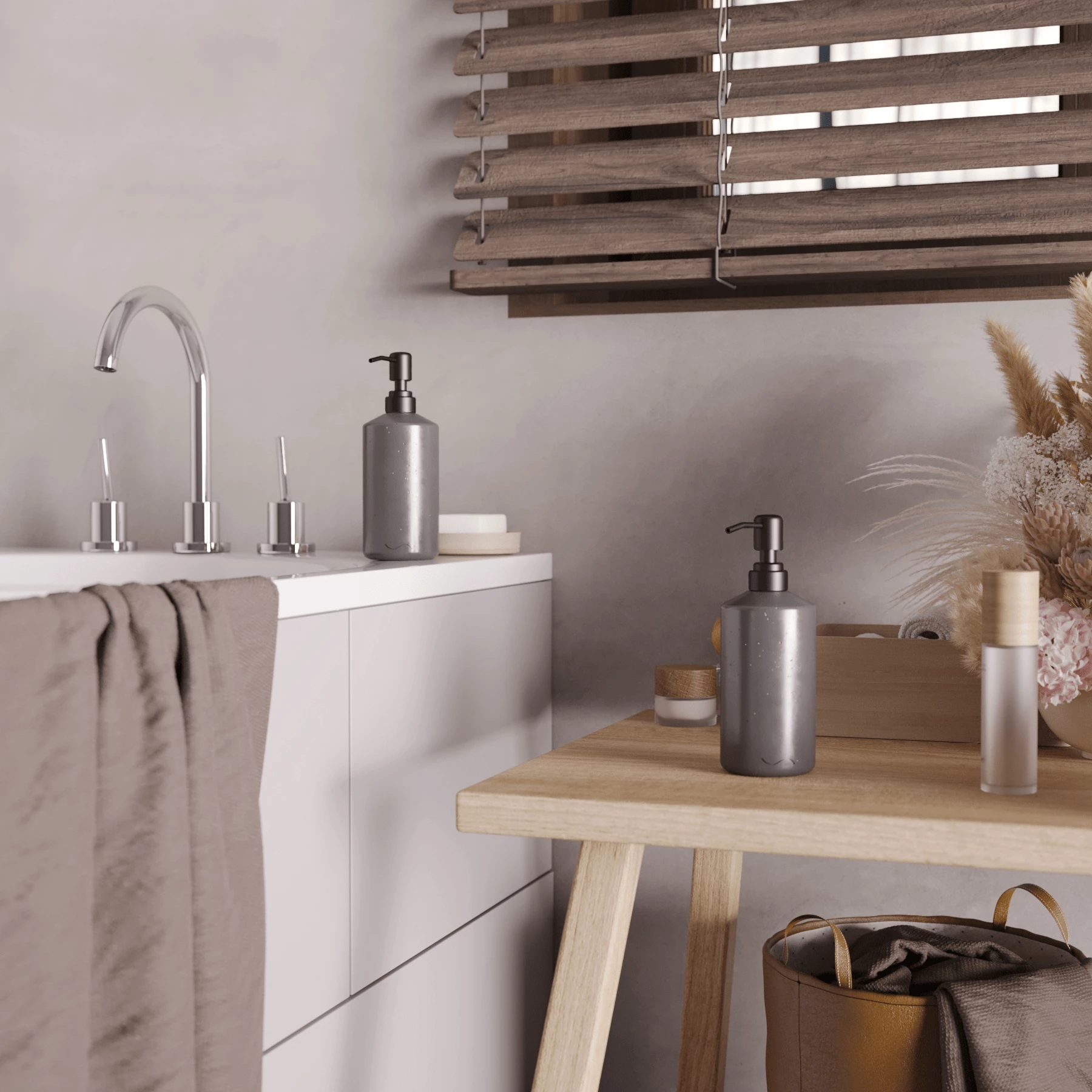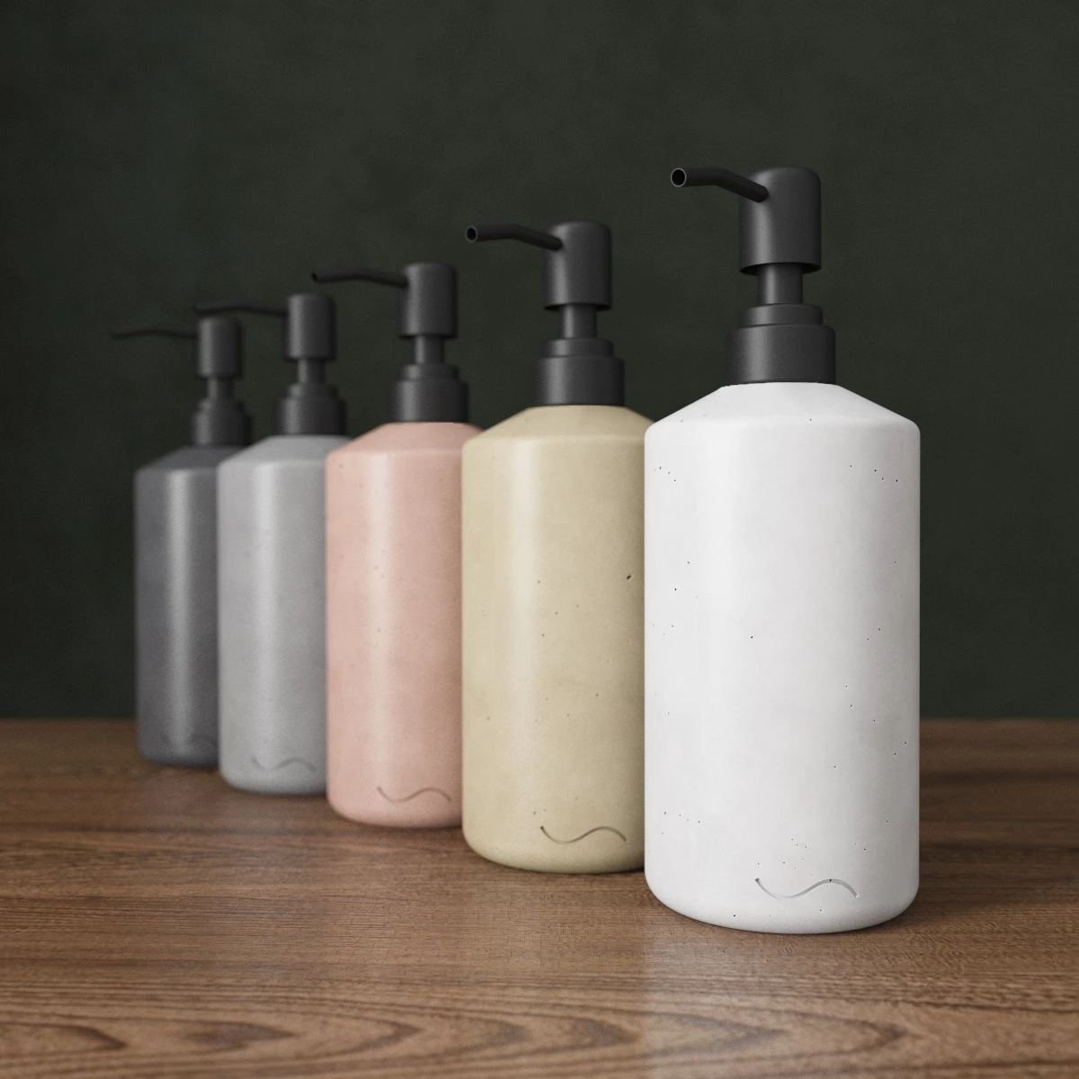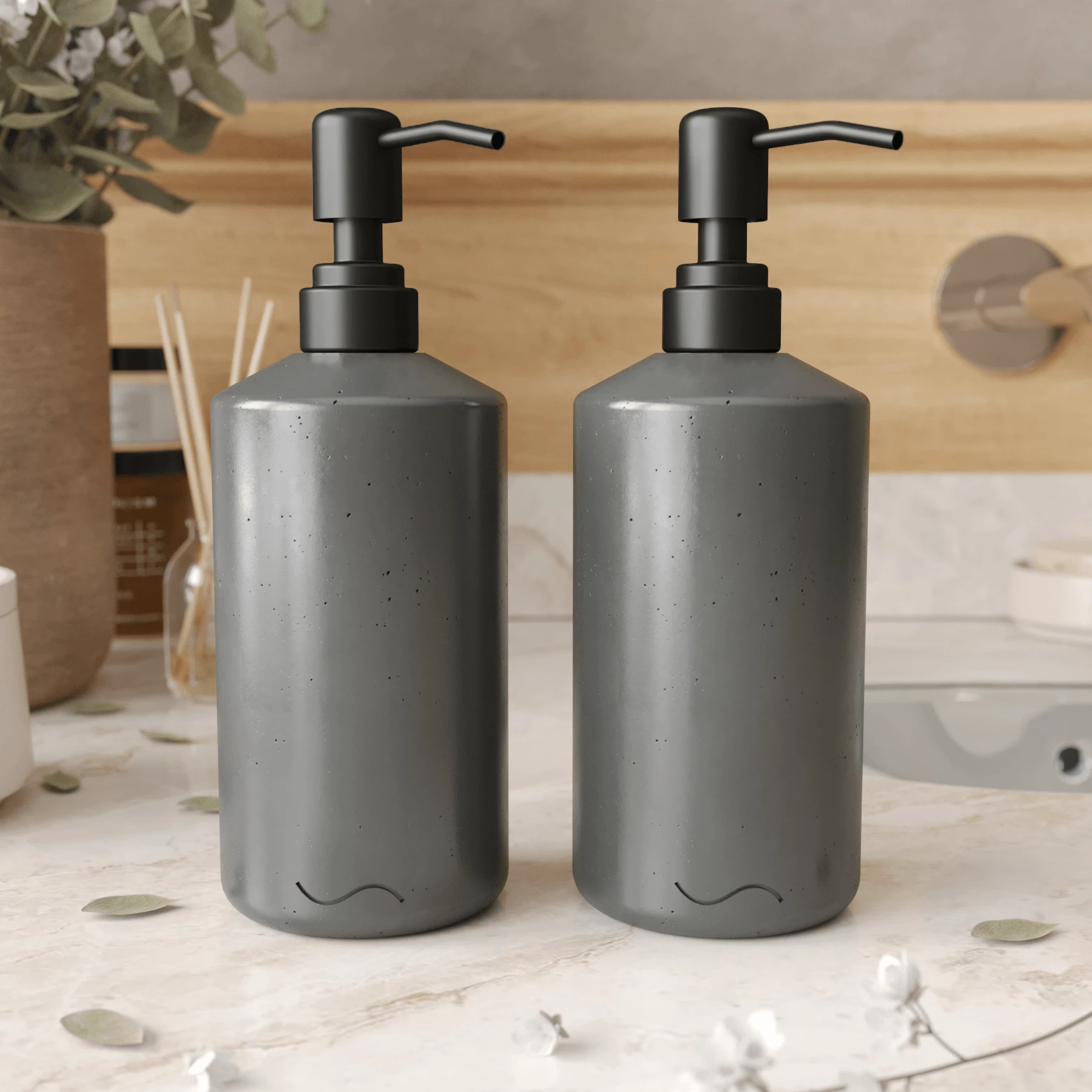 Корпус дозаторов изготовлен из декоративного бетона, а помпа - из металла. Внутри находится ёмкость из прочного пластика.