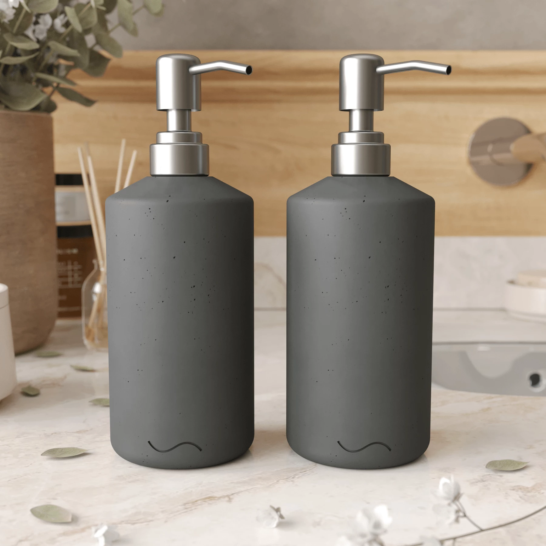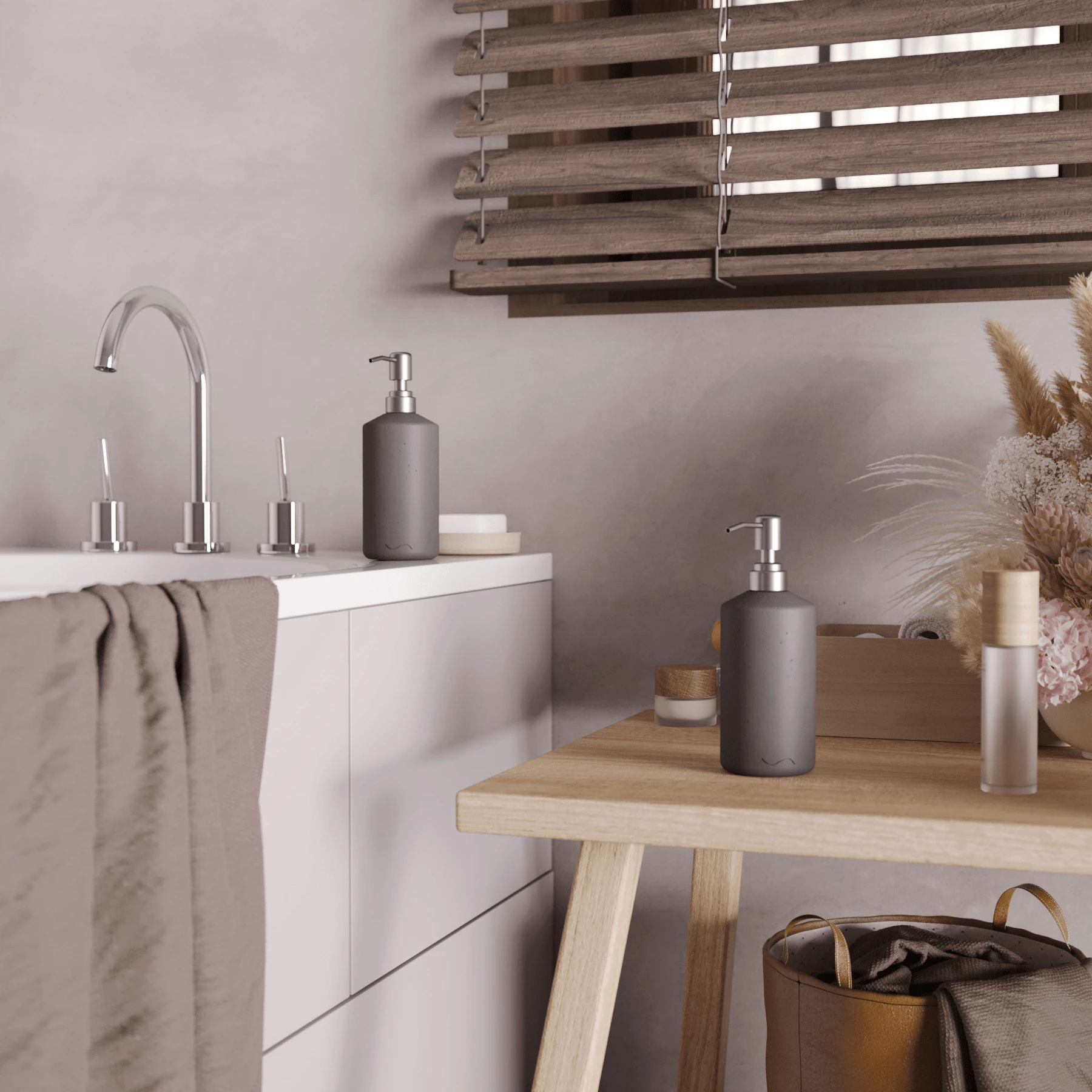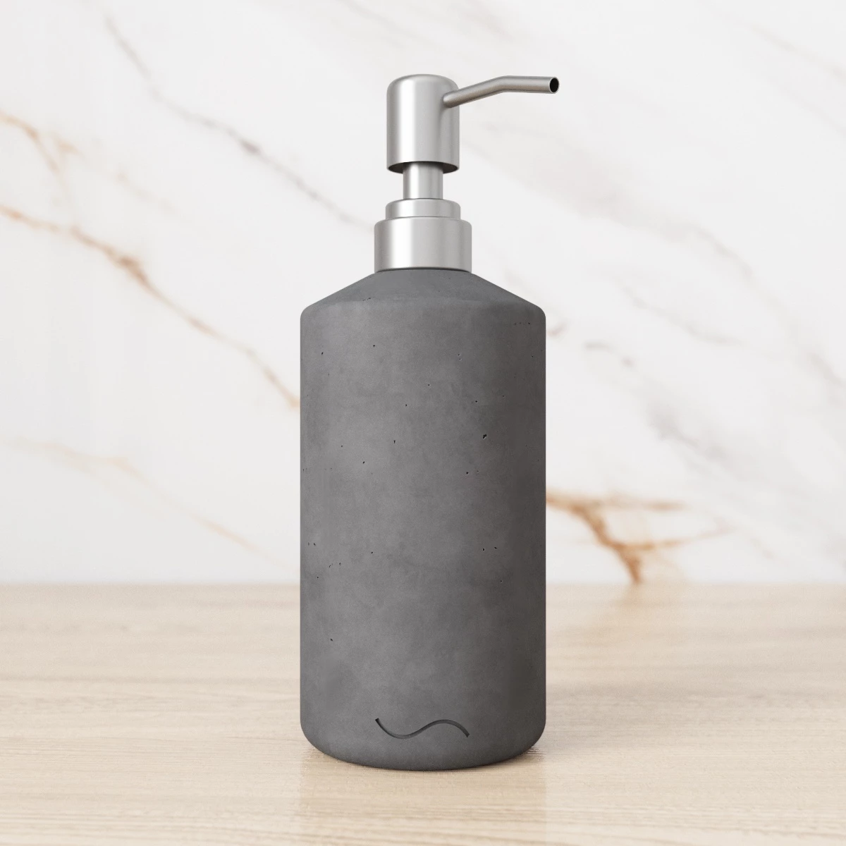 Корпус дозаторов изготовлен из декоративного бетона, а помпа - из металла. Внутри находится ёмкость из прочного пластика.