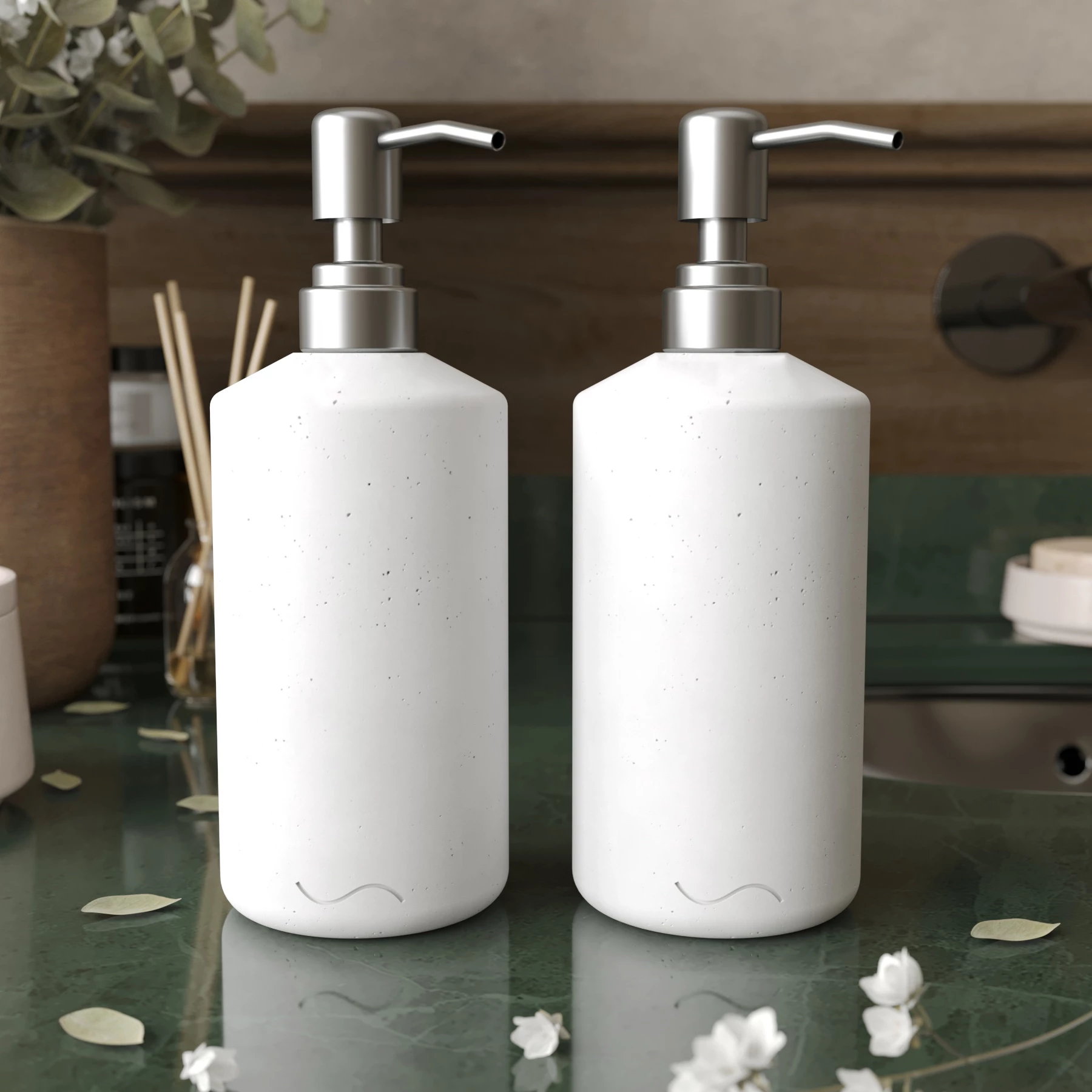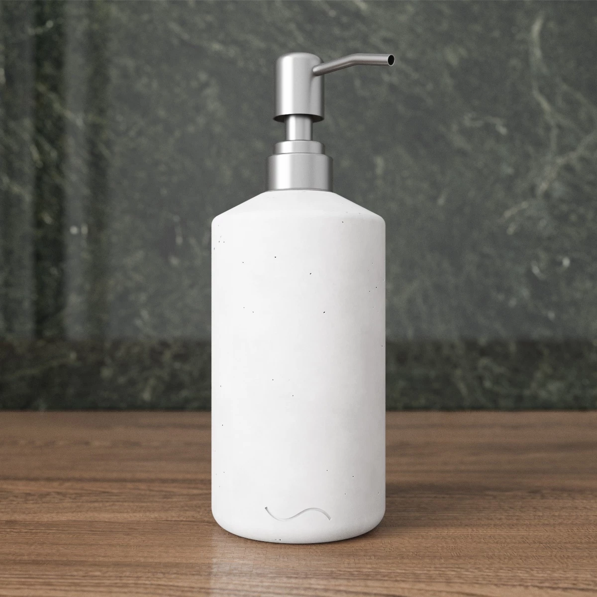 Корпус дозаторов изготовлен из декоративного бетона, а помпа - из металла. Внутри находится ёмкость из прочного пластика.