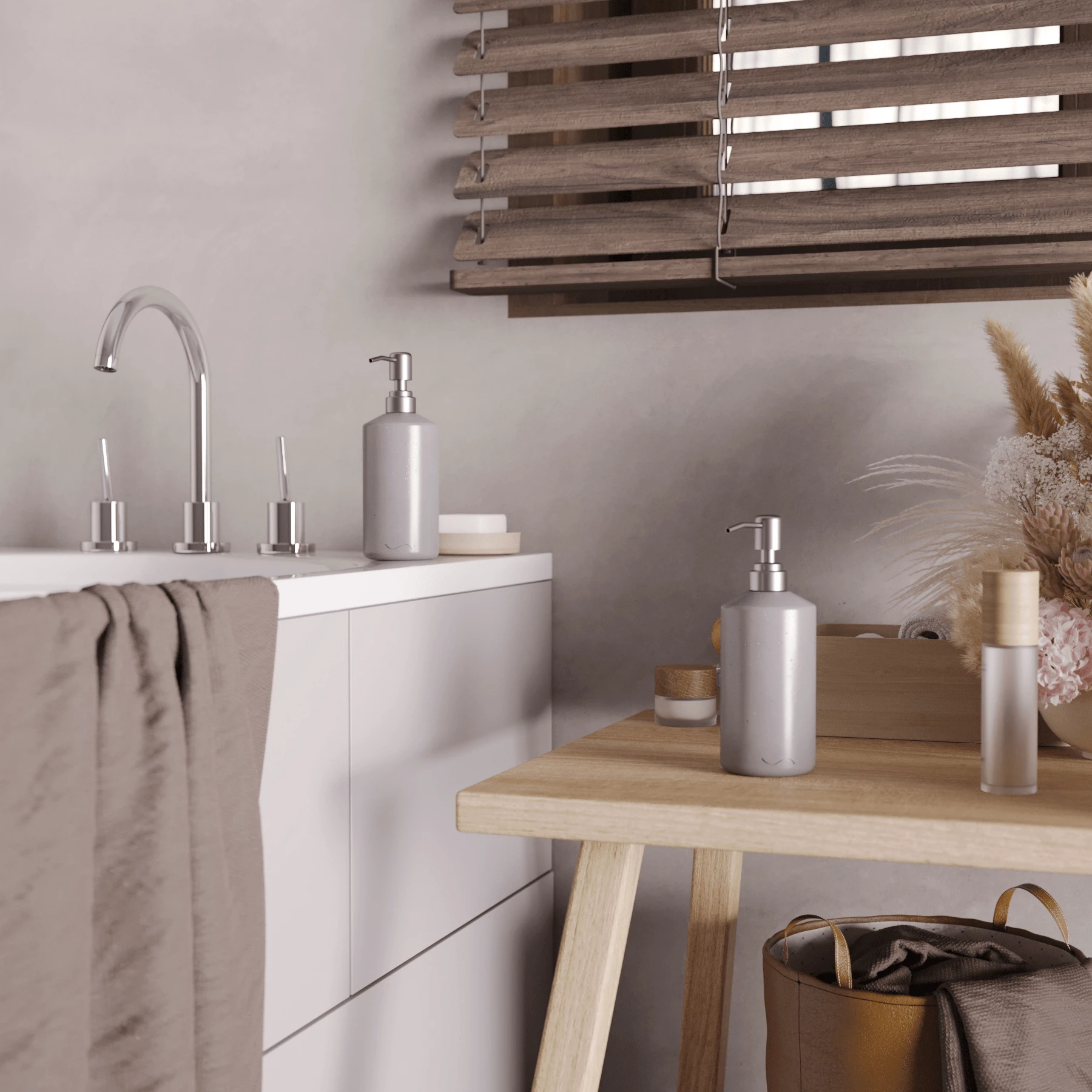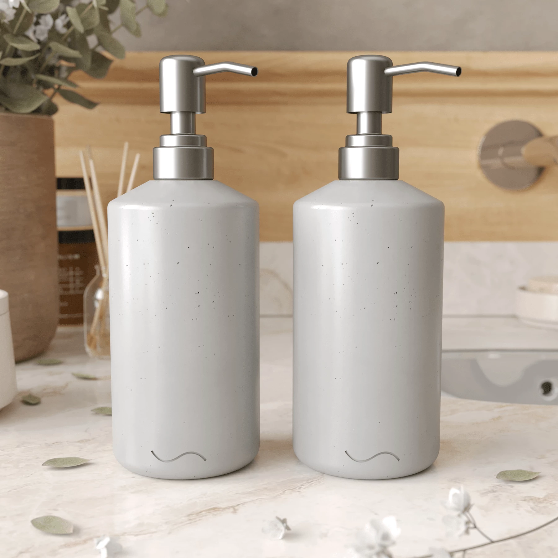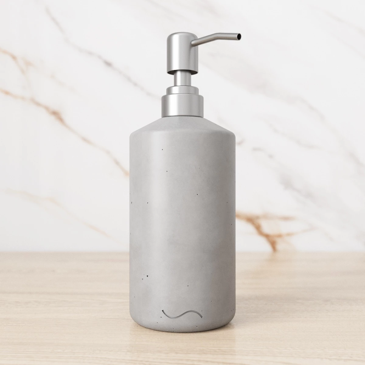 Корпус дозаторов изготовлен из декоративного бетона, а помпа - из металла. Внутри находится ёмкость из прочного пластика.