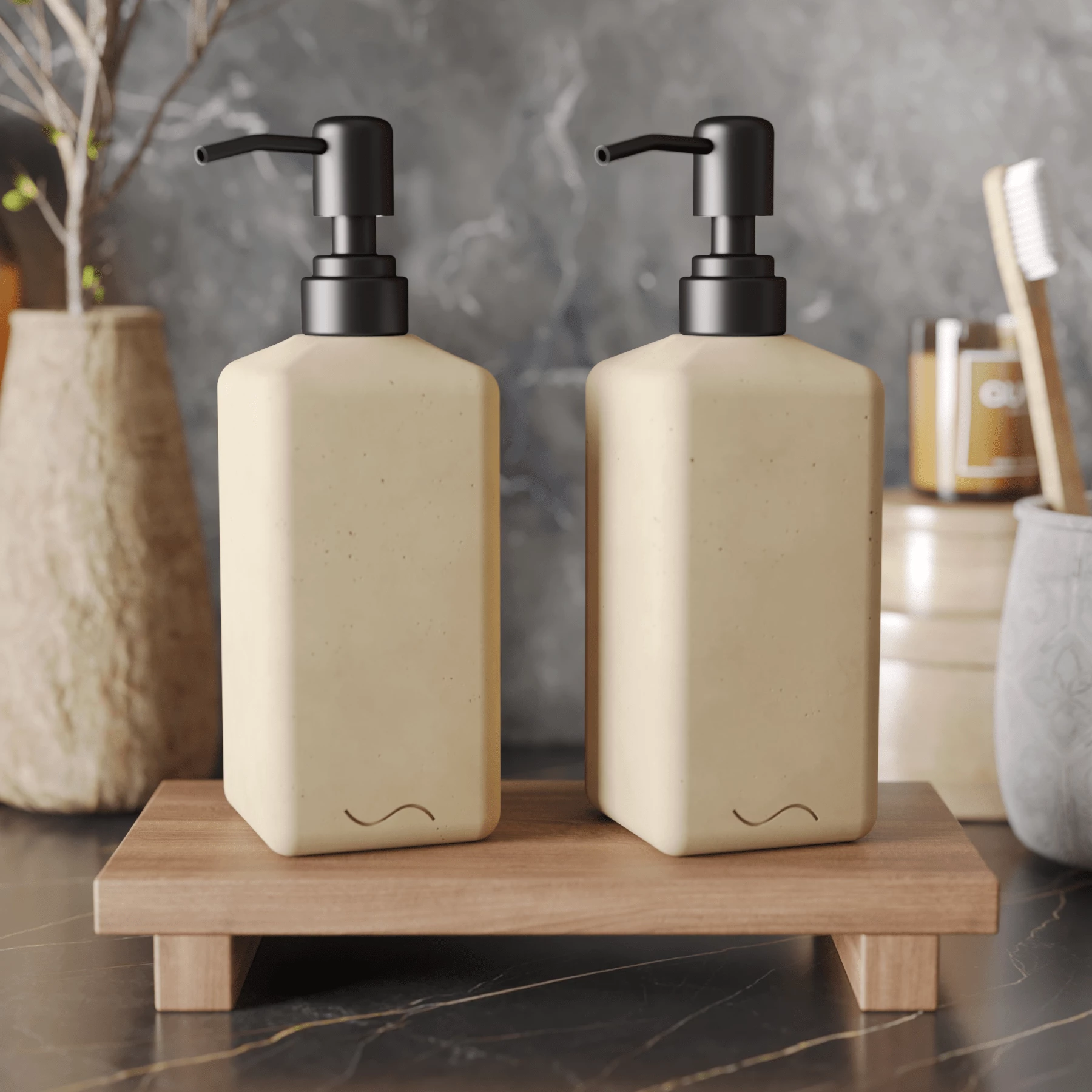 Корпус дозаторов изготовлен из декоративного бетона, а помпа - из металла. Внутри находится ёмкость из прочного пластика.