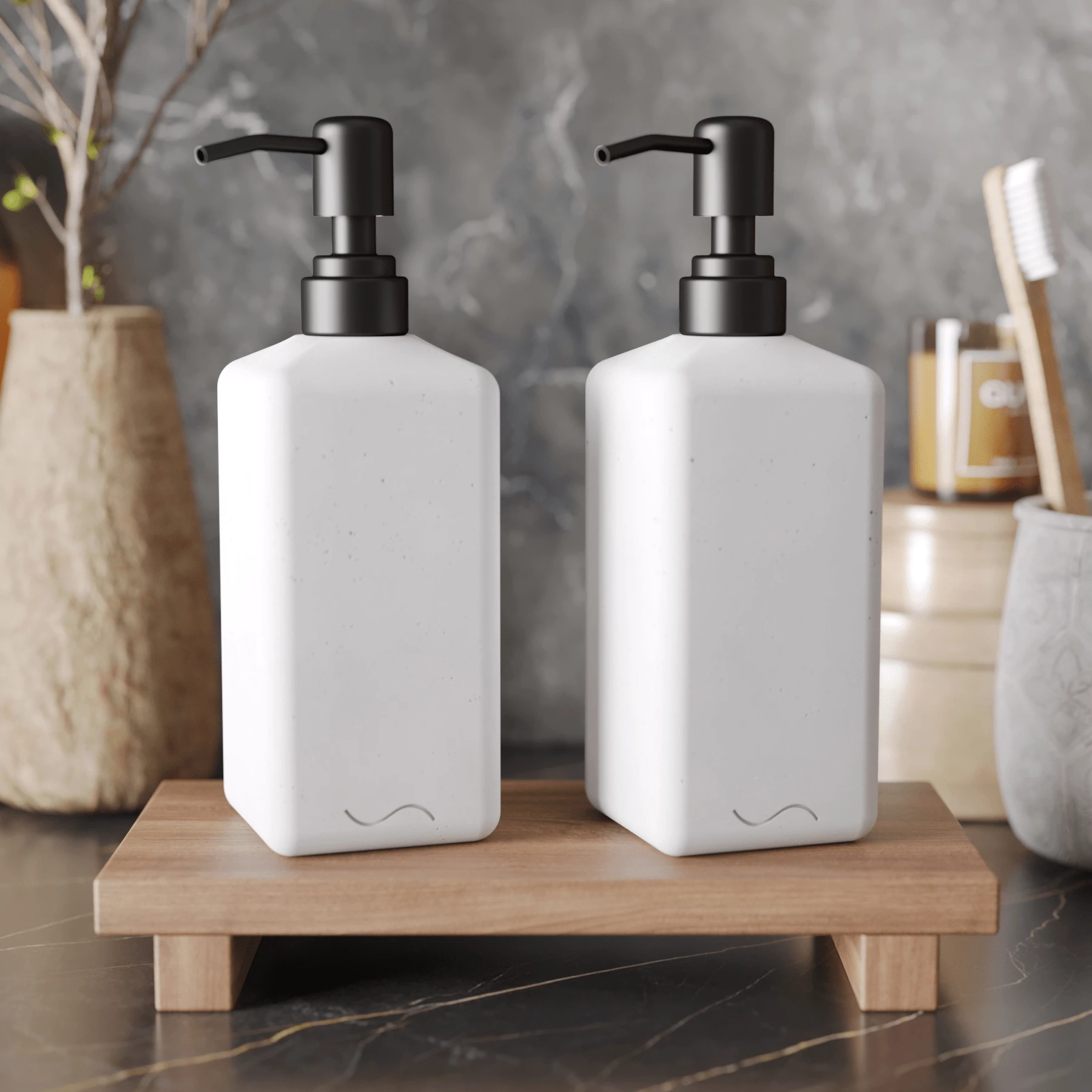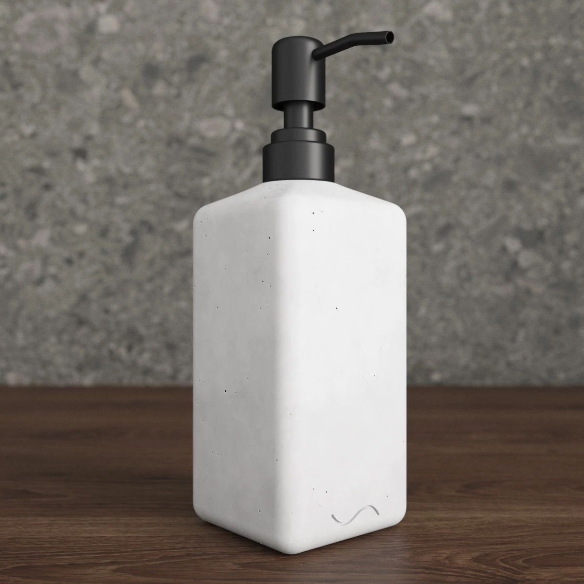Корпус дозаторов изготовлен из декоративного бетона, а помпа - из металла. Внутри находится ёмкость из прочного пластика.