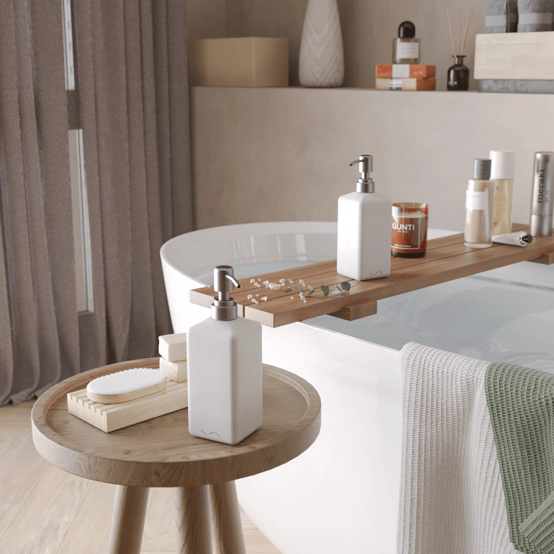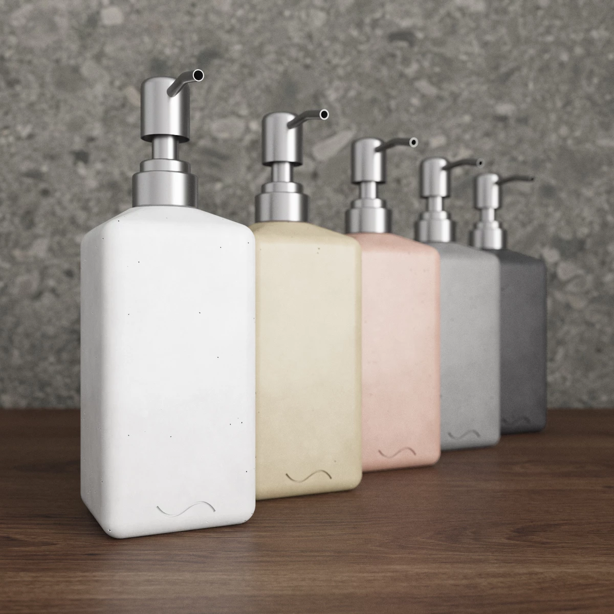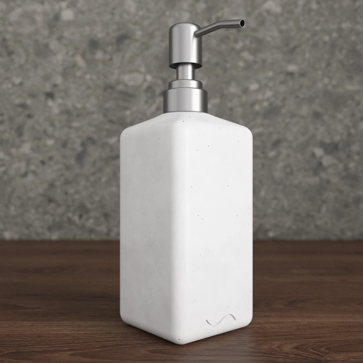 Корпус дозаторов изготовлен из декоративного бетона, а помпа - из металла. Внутри находится ёмкость из прочного пластика.