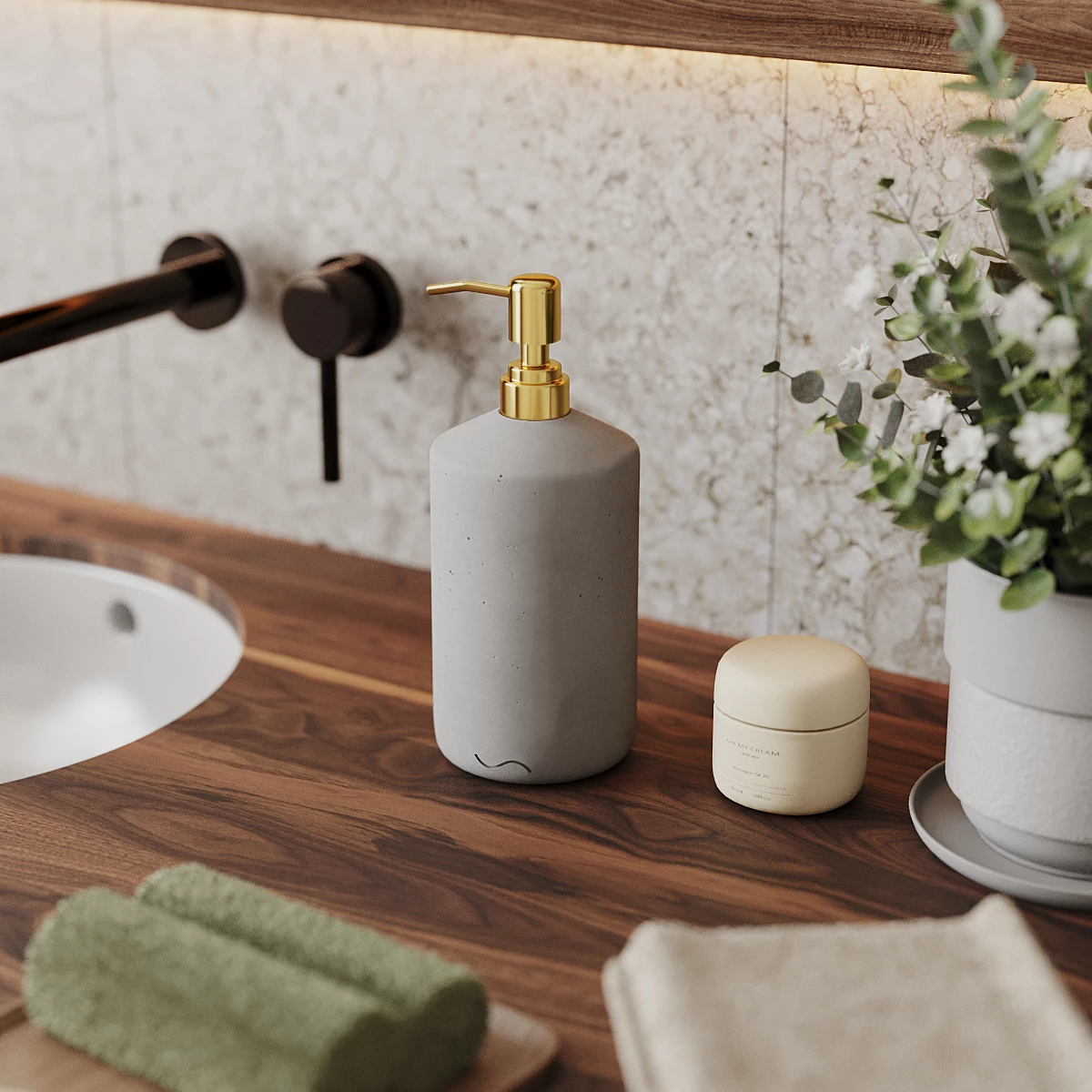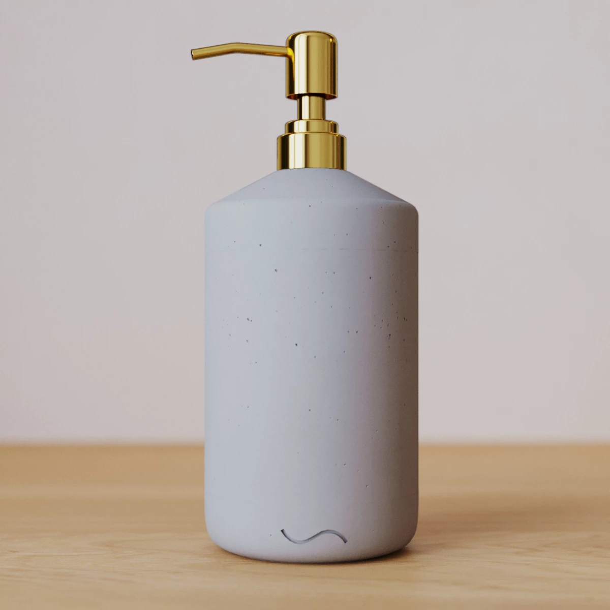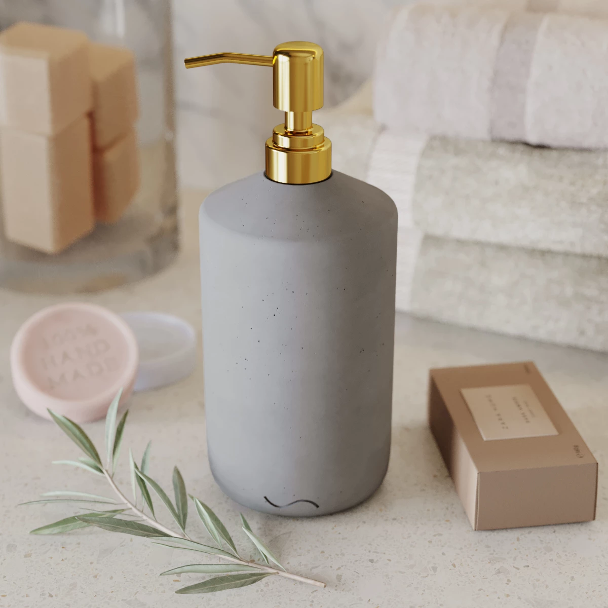 Корпус дозатора изготовлен из декоративного бетона, а помпа - из металла. Внутри дозатора находится емкость из прочного пластика.