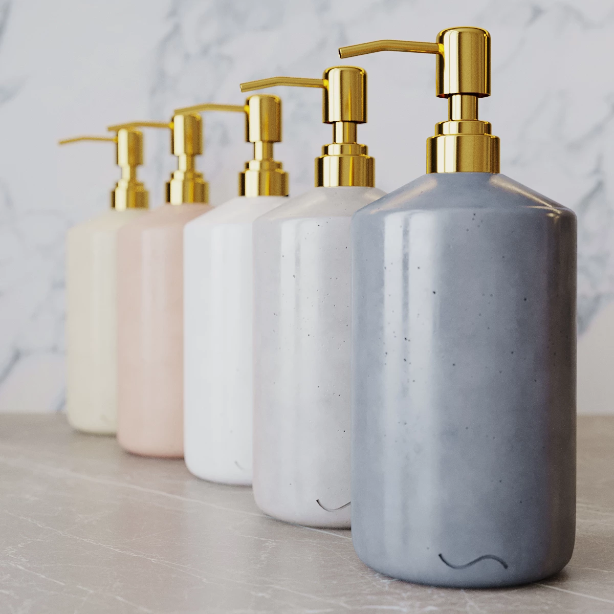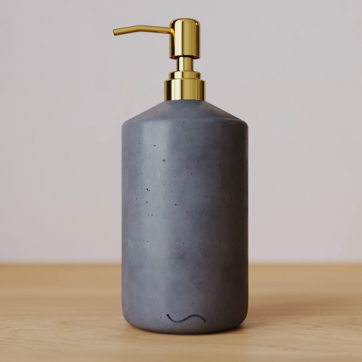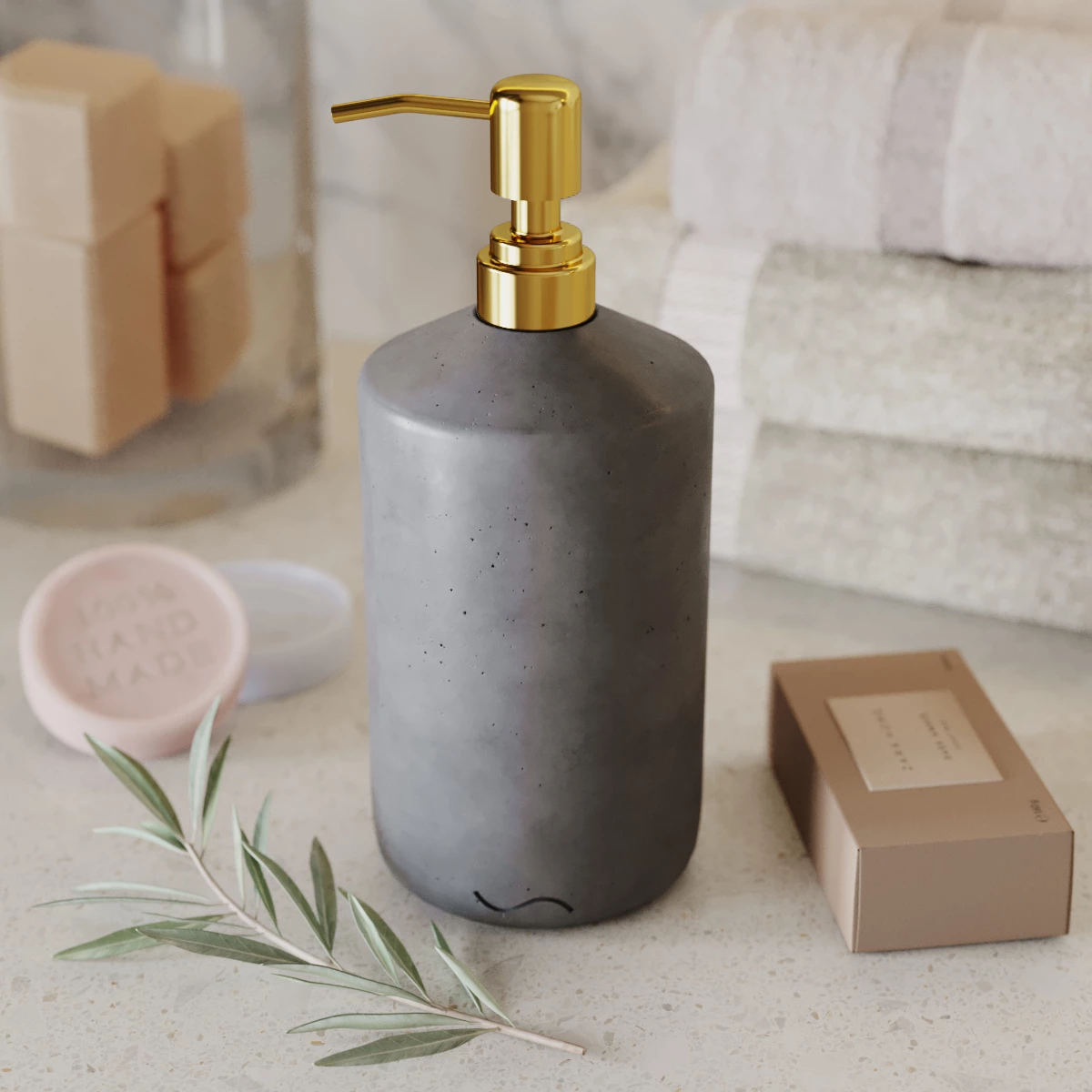 Корпус дозатора изготовлен из декоративного бетона, а помпа - из металла. Внутри дозатора находится емкость из прочного пластика.