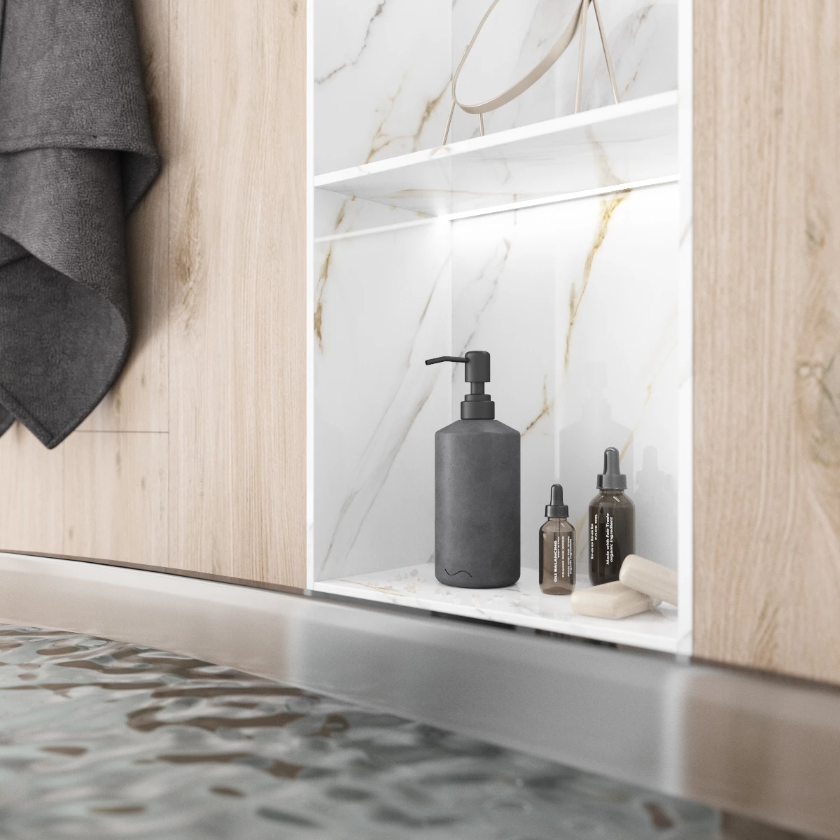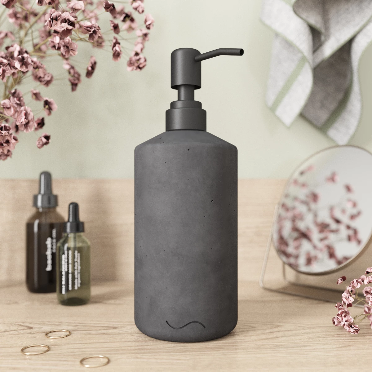 Корпус дозатора изготовлен из декоративного бетона, а помпа - из металла. Внутри дозатора находится емкость из прочного пластика.