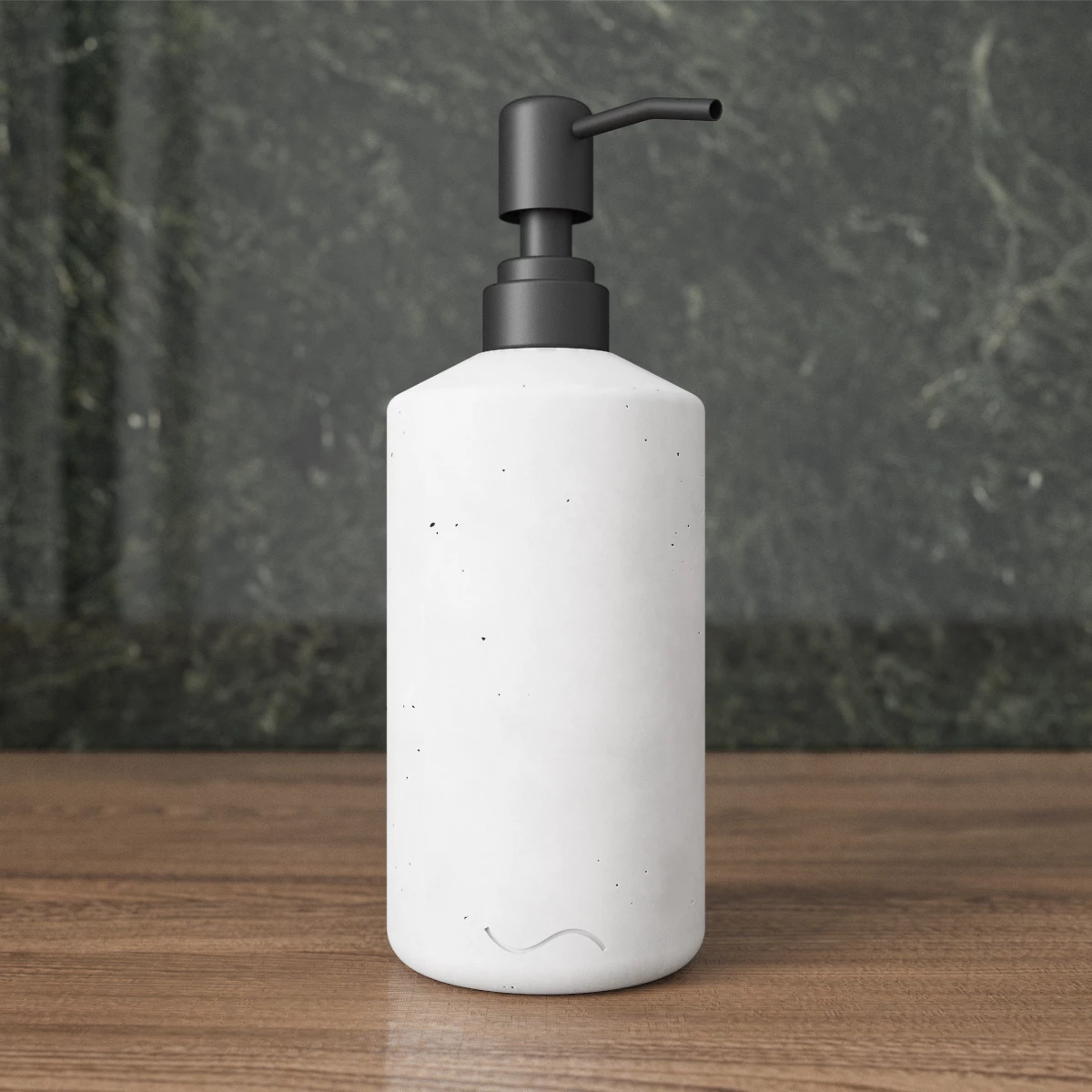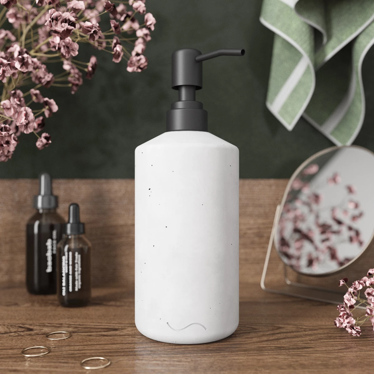 Корпус дозатора изготовлен из декоративного бетона, а помпа - из металла. Внутри дозатора находится емкость из прочного пластика.