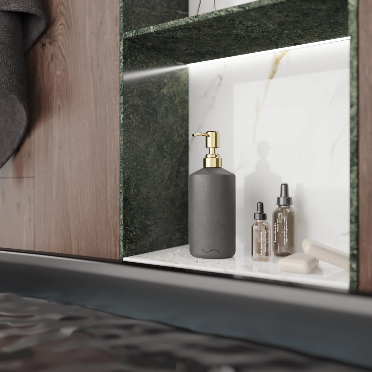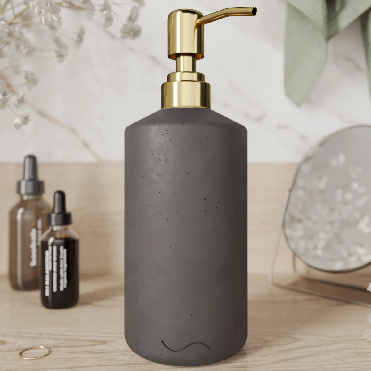 Корпус дозатора изготовлен из декоративного бетона, а помпа - из металла. Внутри дозатора находится емкость из прочного пластика.