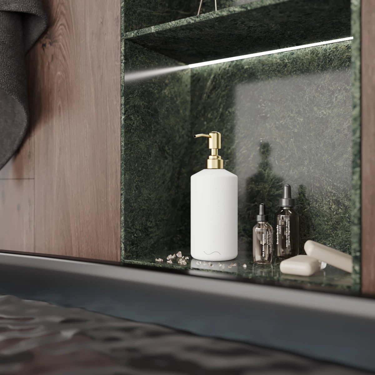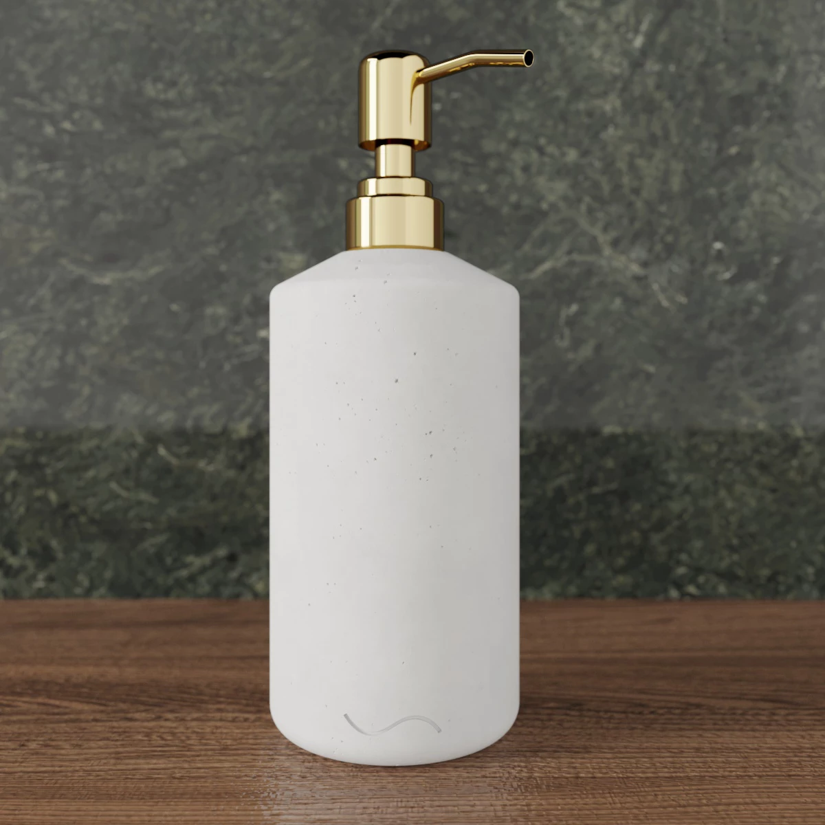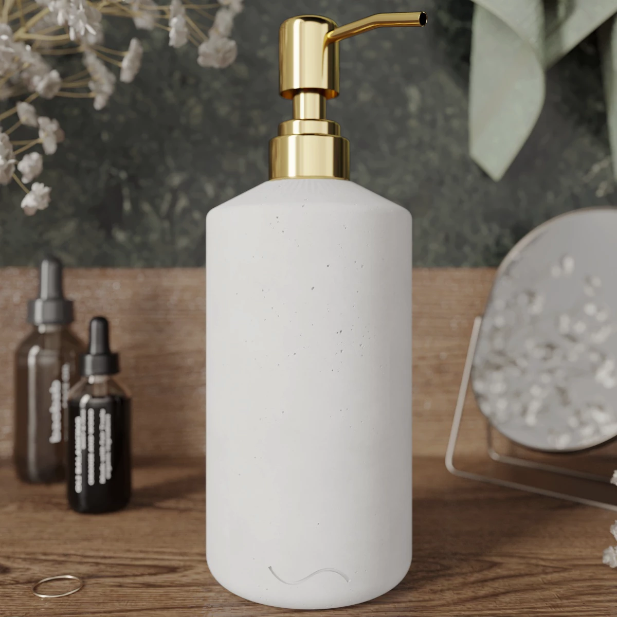 Корпус дозатора изготовлен из декоративного бетона, а помпа - из металла. Внутри дозатора находится емкость из прочного пластика.