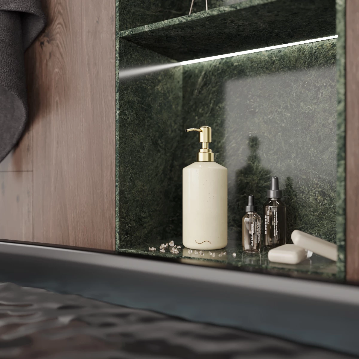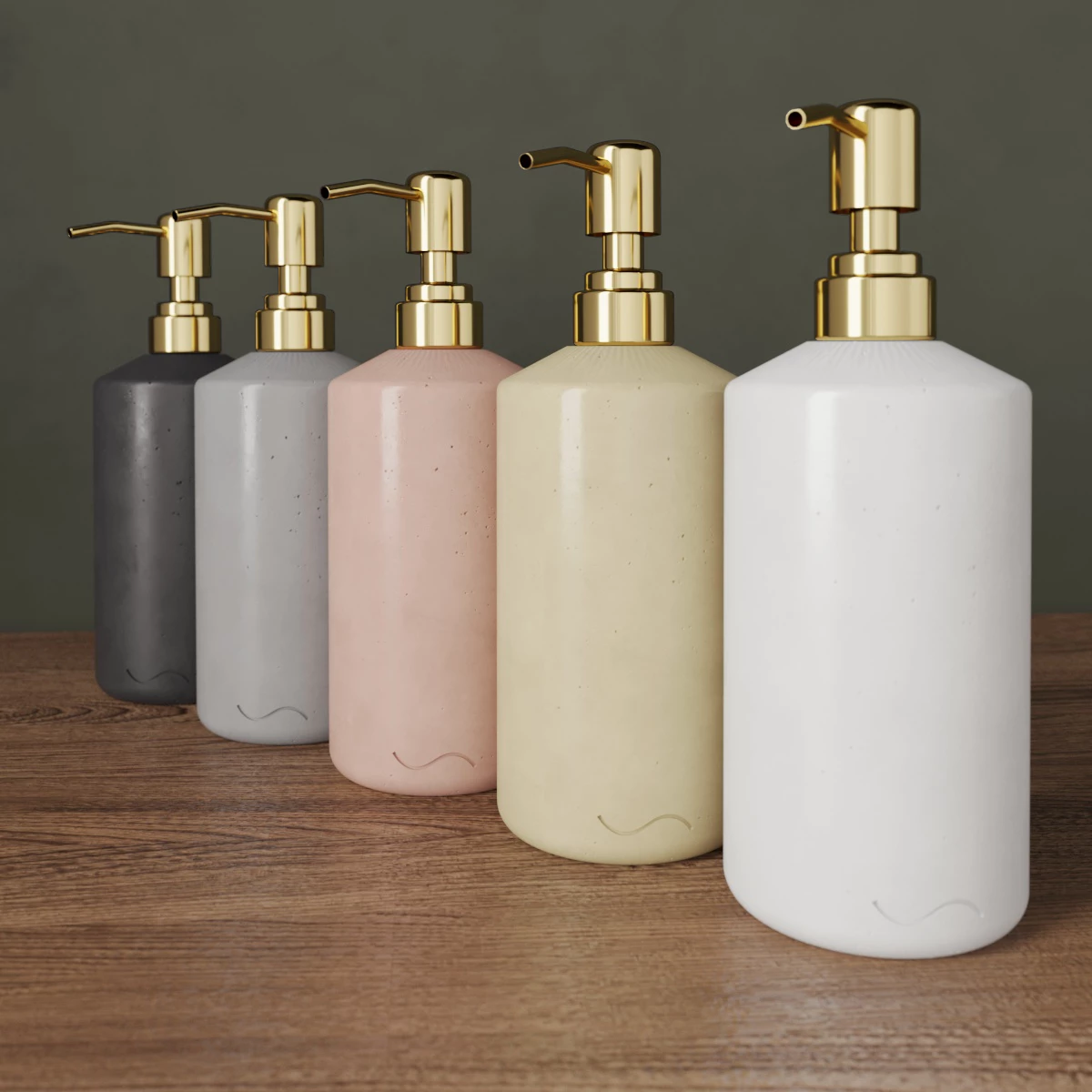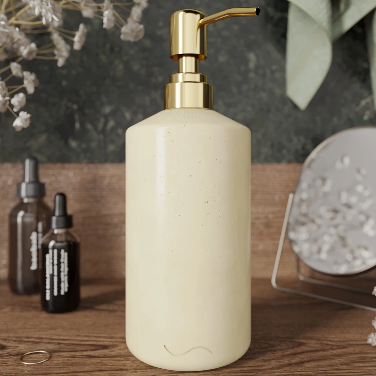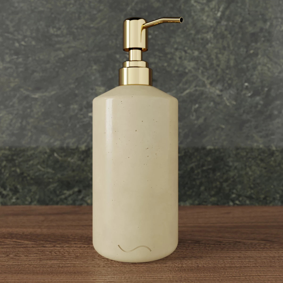 Корпус дозатора изготовлен из декоративного бетона, а помпа - из металла. Внутри дозатора находится емкость из прочного пластика.