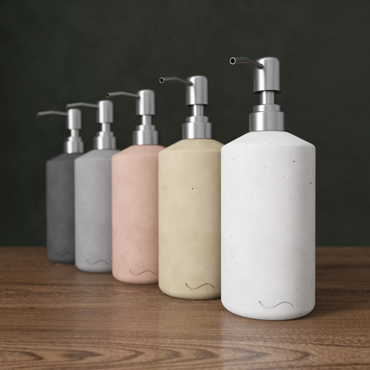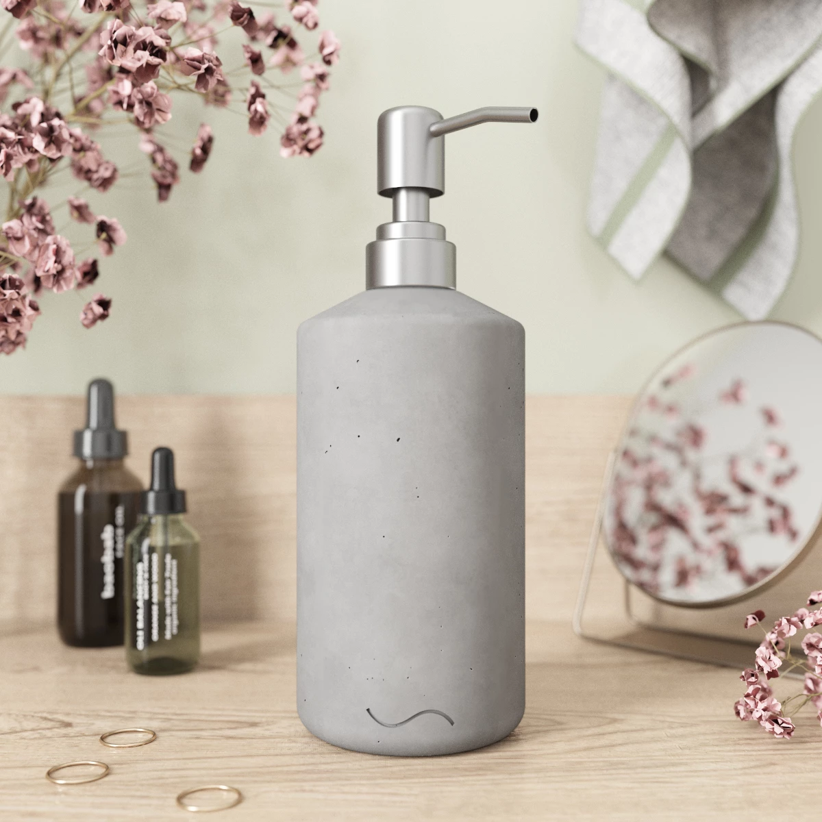 Корпус дозатора изготовлен из декоративного бетона, а помпа - из металла. Внутри дозатора находится емкость из прочного пластика.