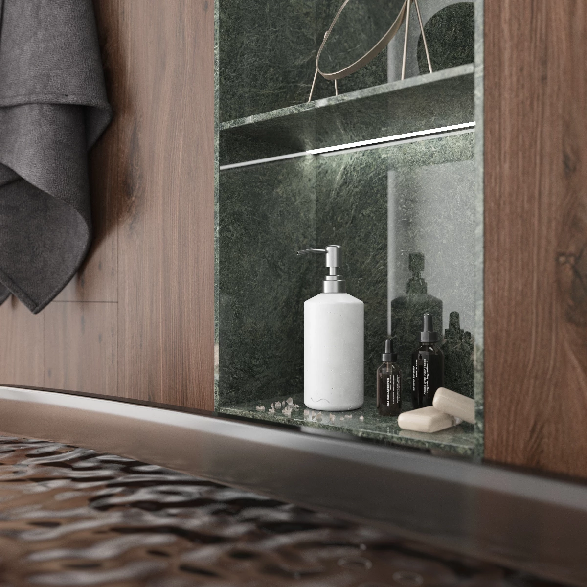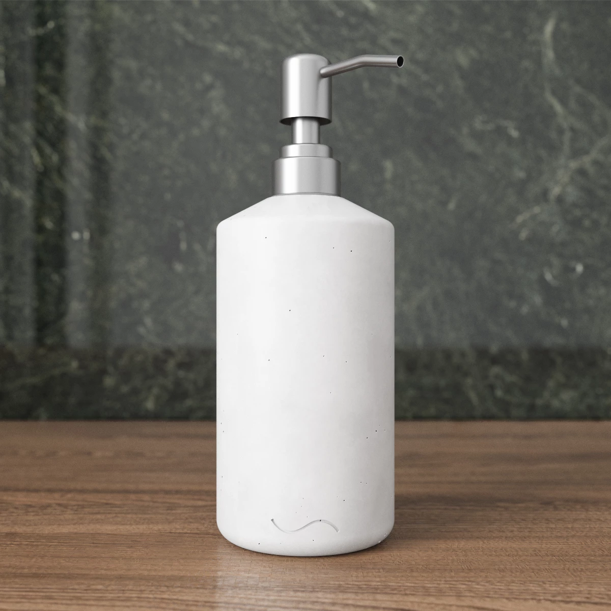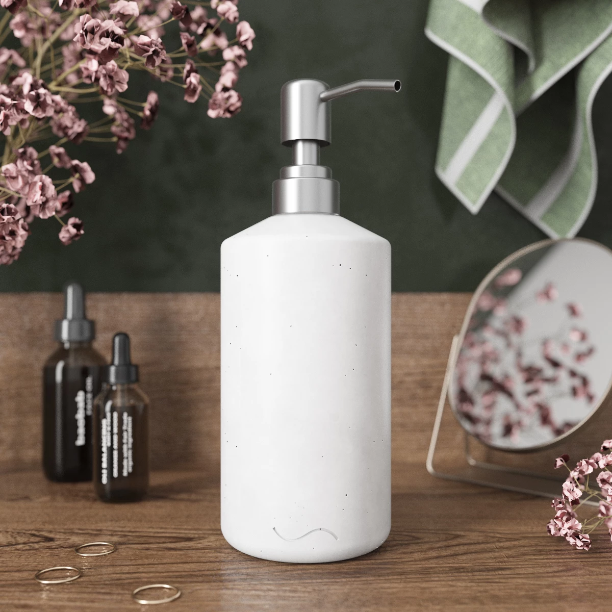 Корпус дозатора изготовлен из декоративного бетона, а помпа - из металла. Внутри дозатора находится емкость из прочного пластика.