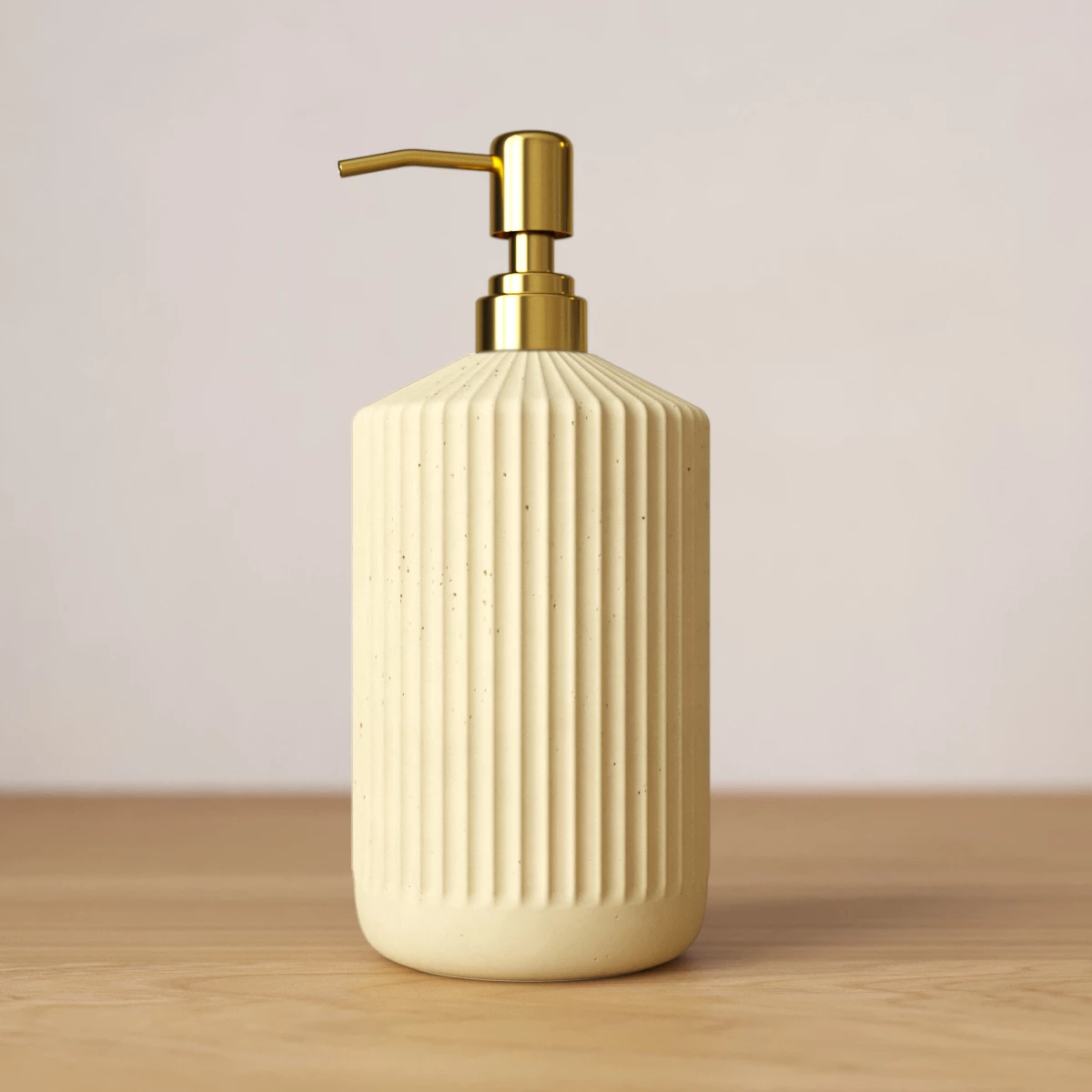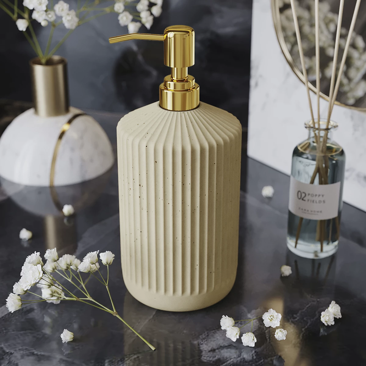 Корпус дозатора изготовлен из декоративного бетона, а помпа - из металла. Внутри дозатора находится емкость из прочного пластика.