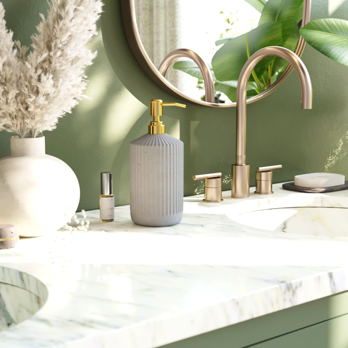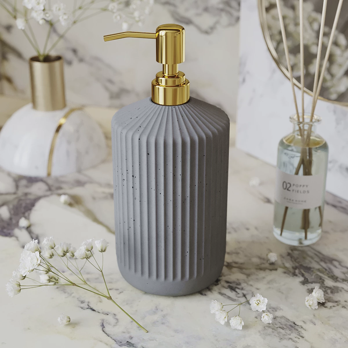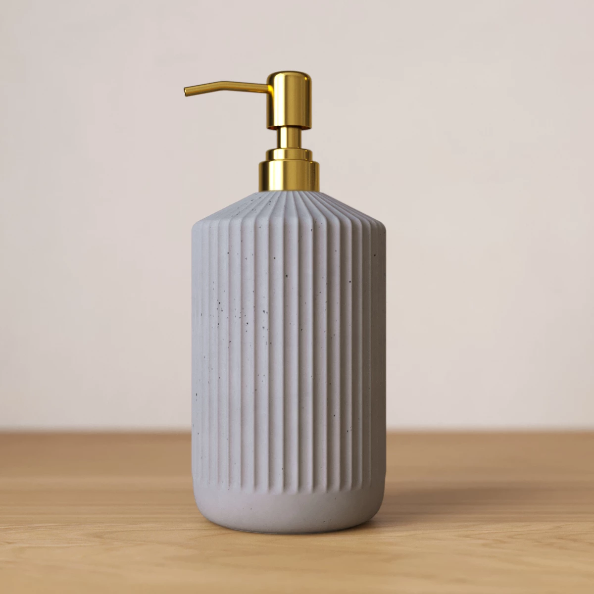 Корпус дозатора изготовлен из декоративного бетона, а помпа - из металла. Внутри дозатора находится емкость из прочного пластика.