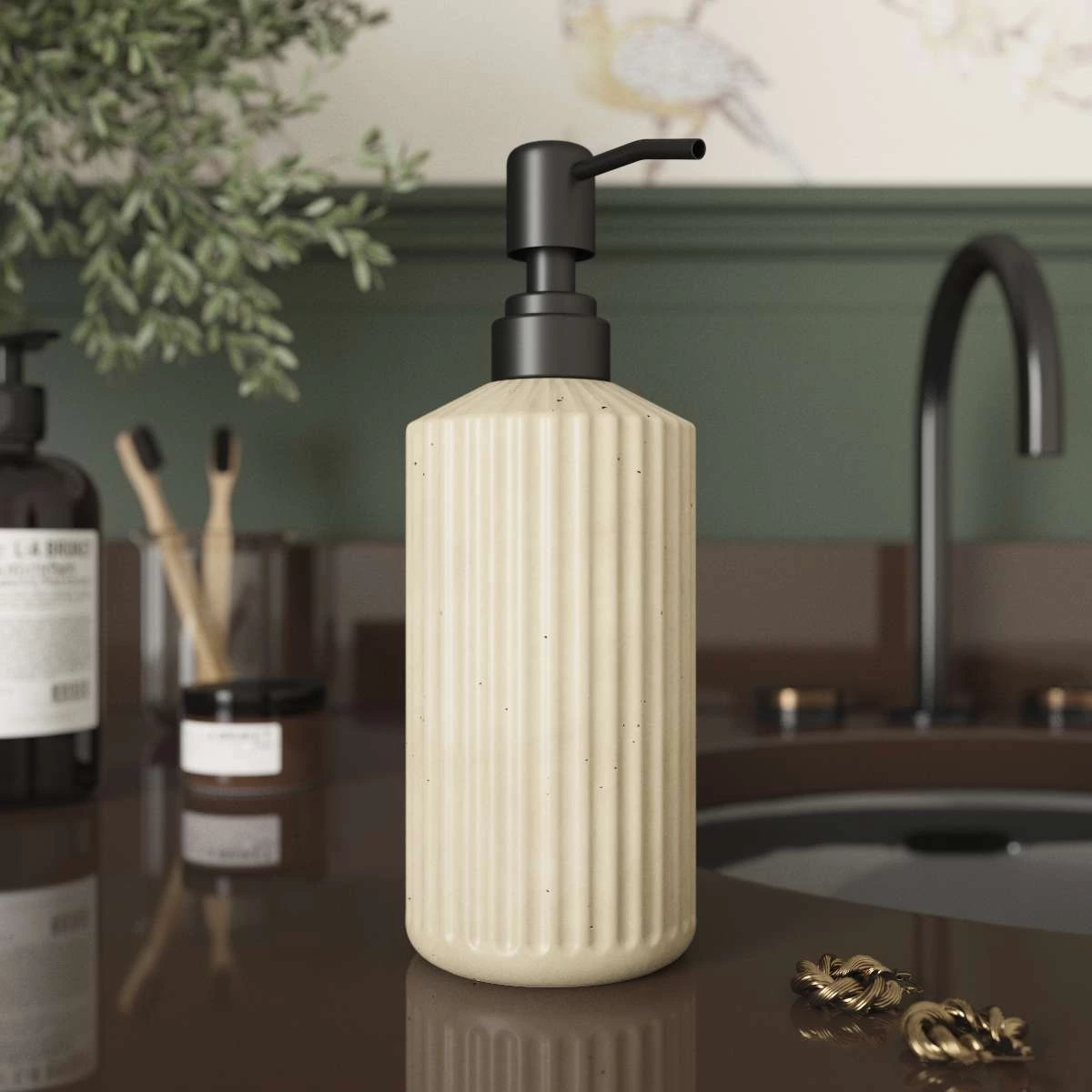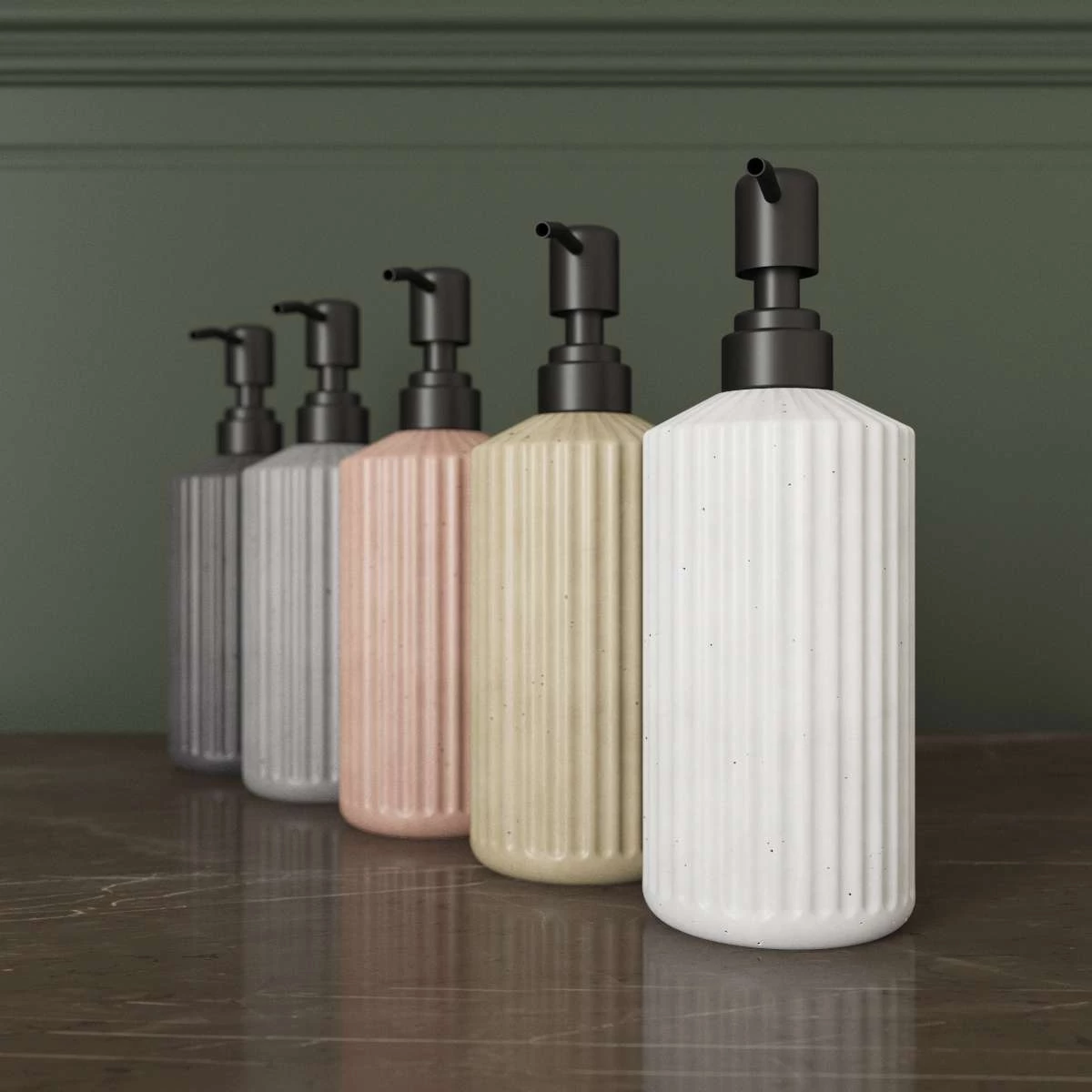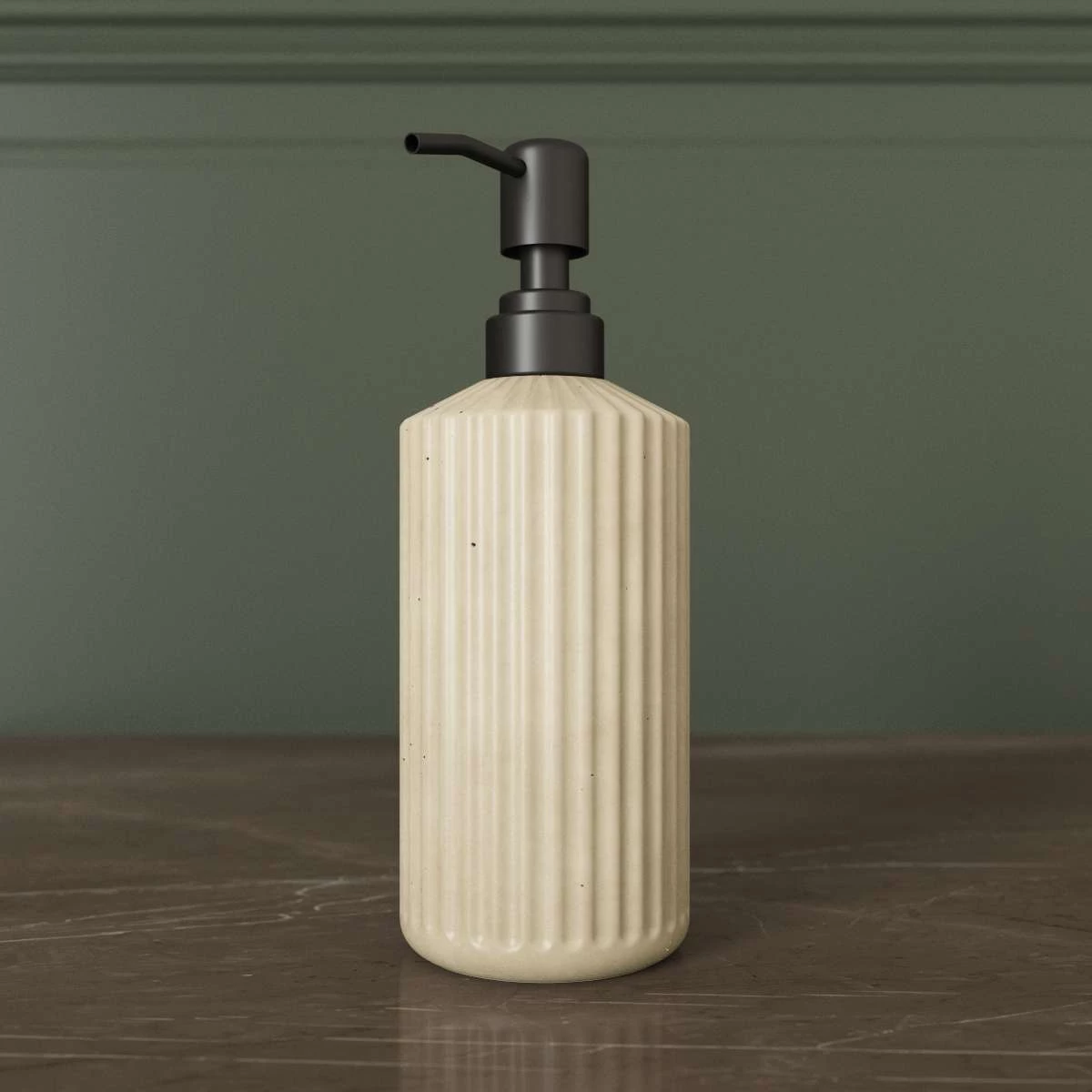 Корпус дозатора изготовлен из декоративного бетона, а помпа - из металла. Внутри дозатора находится емкость из прочного пластика.