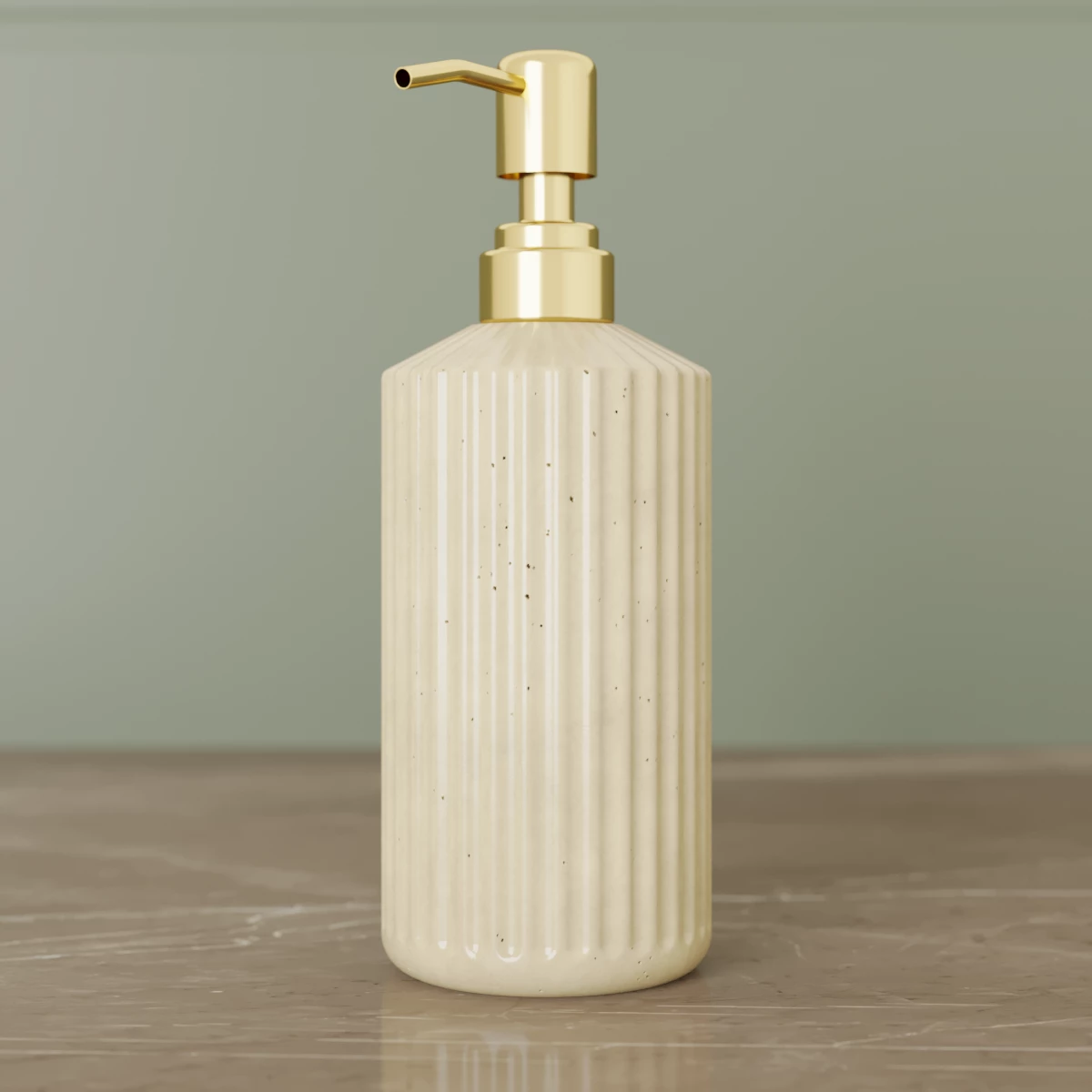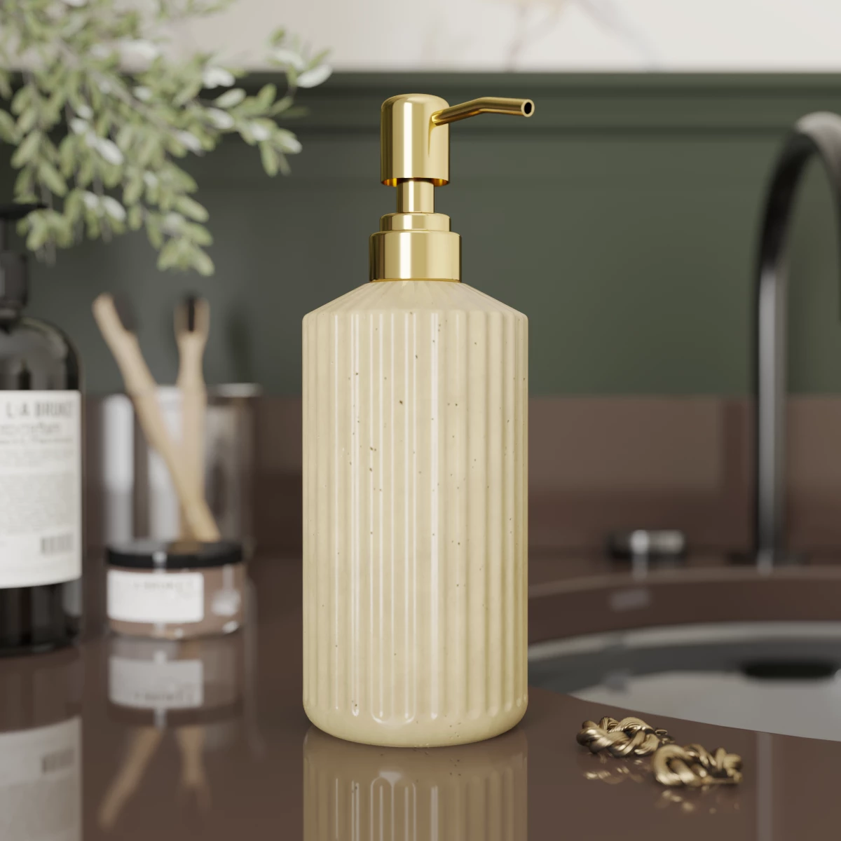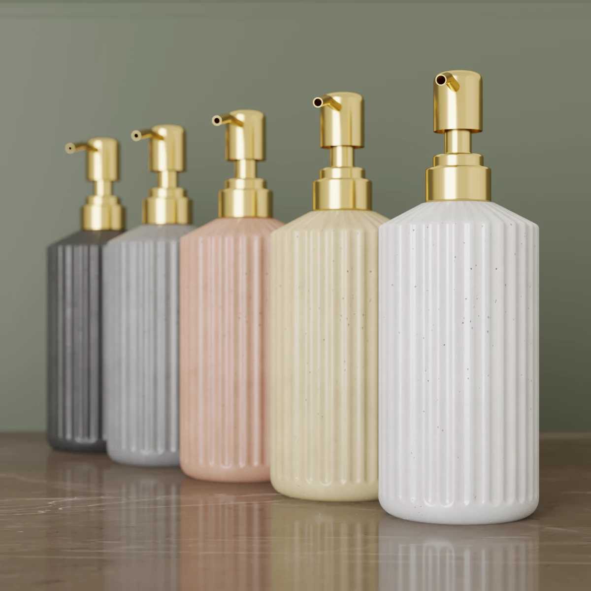 Корпус дозатора изготовлен из декоративного бетона, а помпа - из металла. Внутри дозатора находится емкость из прочного пластика.