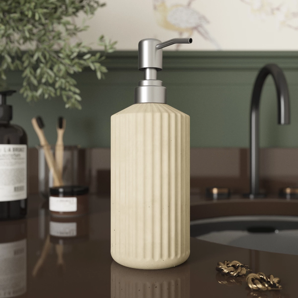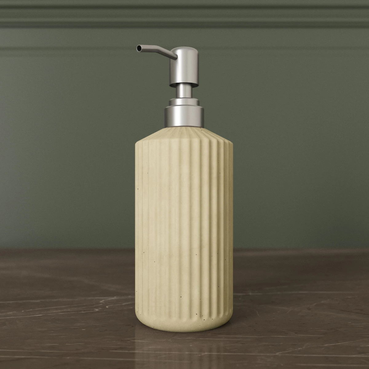 Корпус дозатора изготовлен из декоративного бетона, а помпа - из металла. Внутри дозатора находится емкость из прочного пластика.