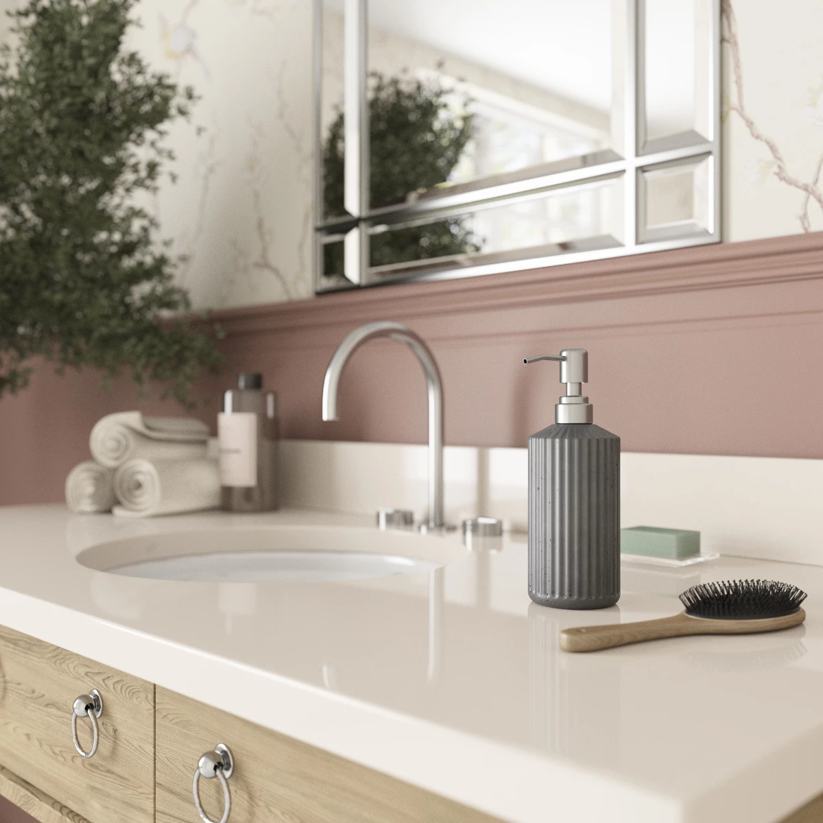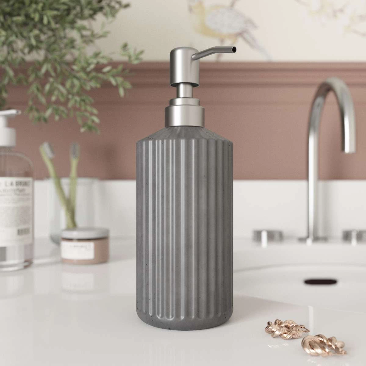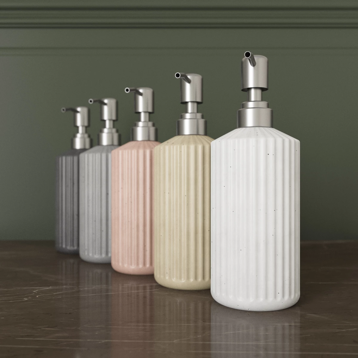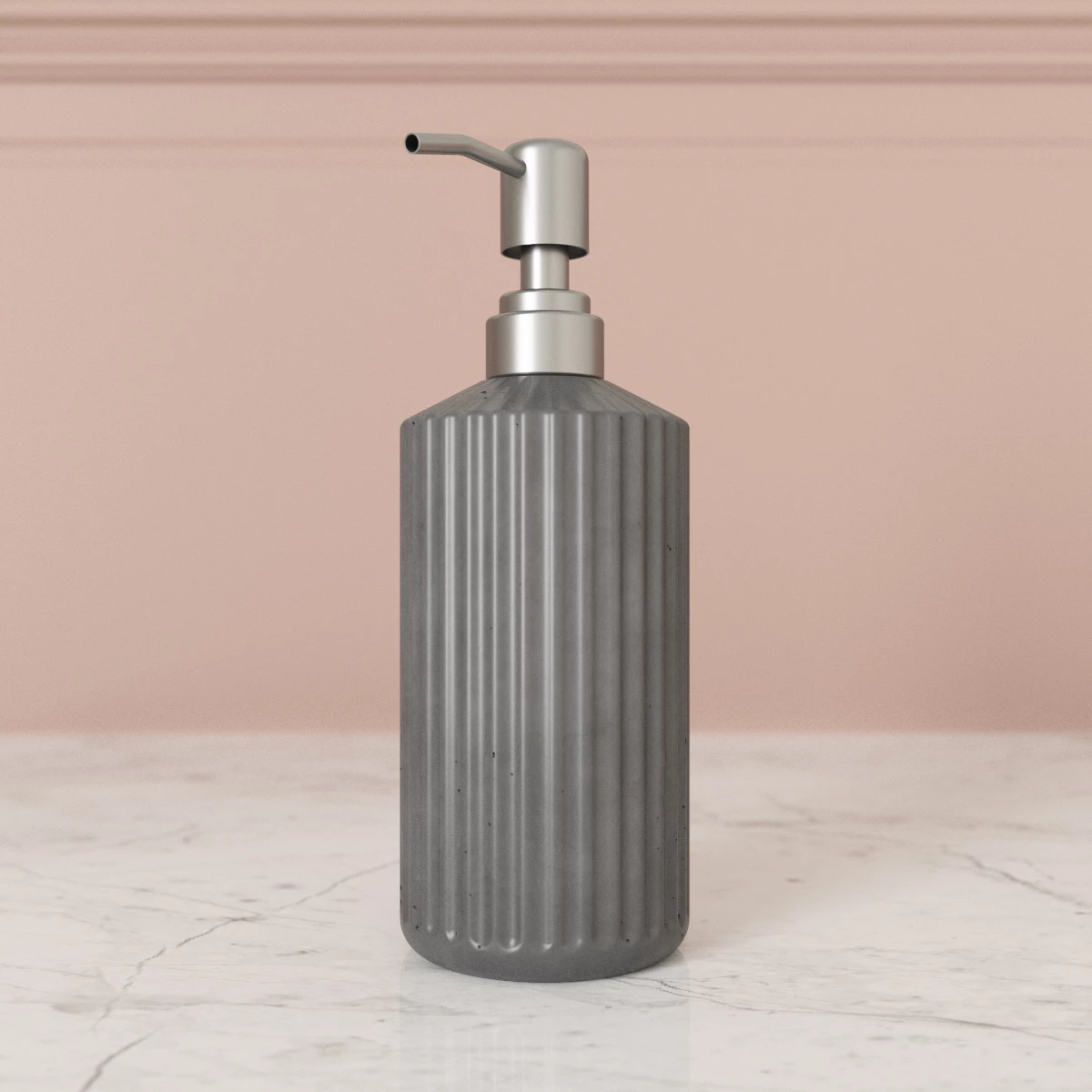 Корпус дозатора изготовлен из декоративного бетона, а помпа - из металла. Внутри дозатора находится емкость из прочного пластика.