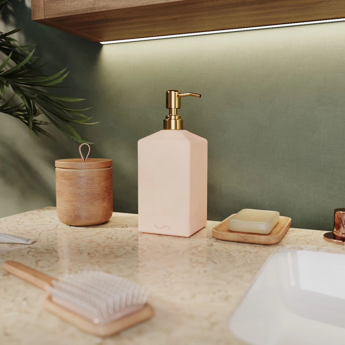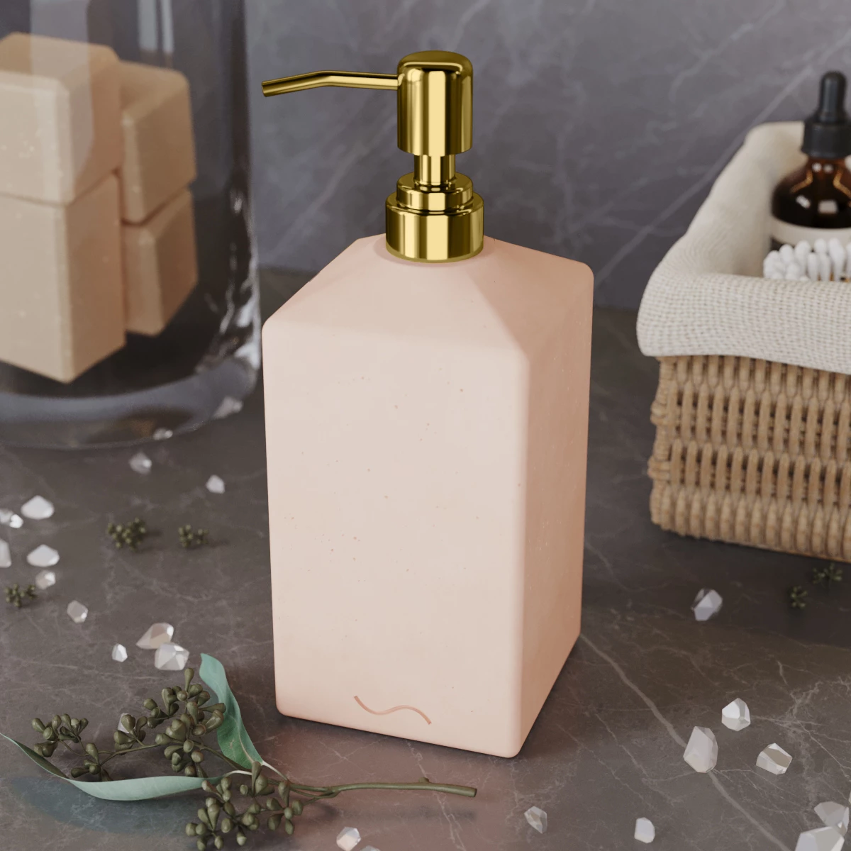 Корпус дозатора изготовлен из декоративного бетона, а помпа - из металла. Внутри дозатора находится емкость из прочного пластика.