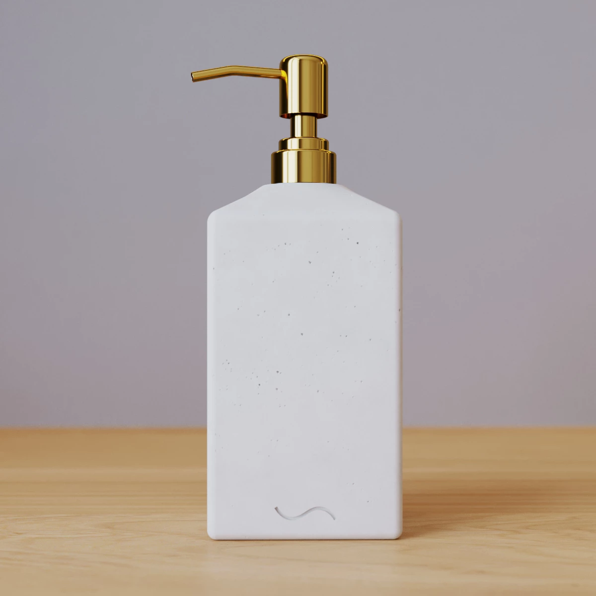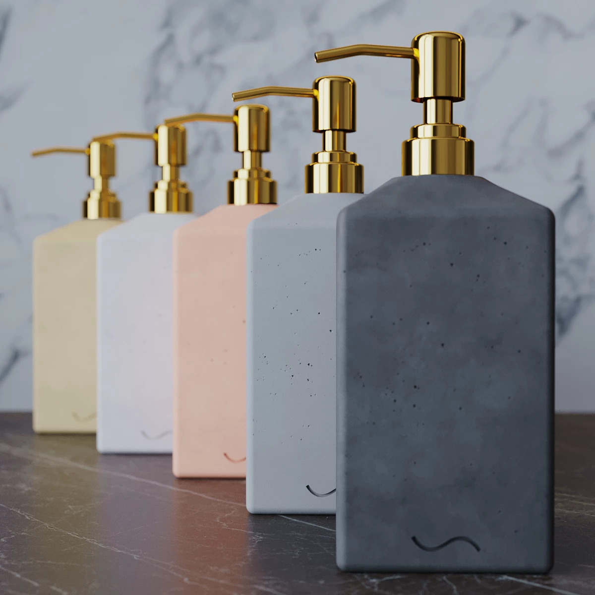 Корпус дозатора изготовлен из декоративного бетона, а помпа - из металла. Внутри дозатора находится емкость из прочного пластика.