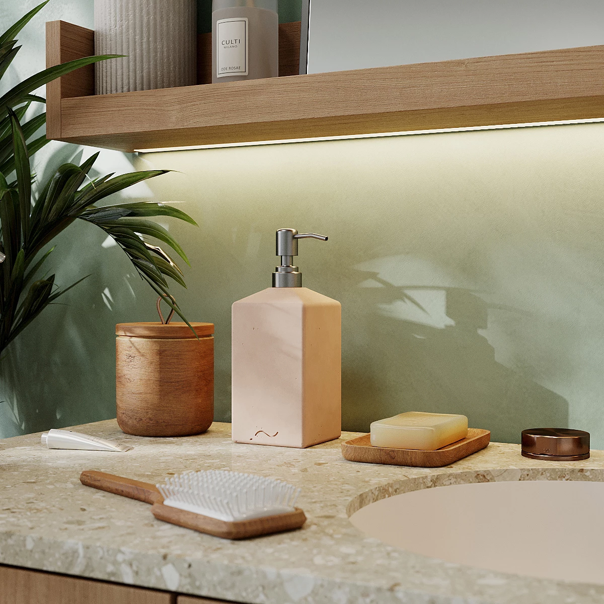 Изделие обработано защитной пропиткой, защищающей бетонную текстуру от воды и грязи. Жидкое мыло или моющее средство наливается в пластиковую емкость, находящуюся внутри.