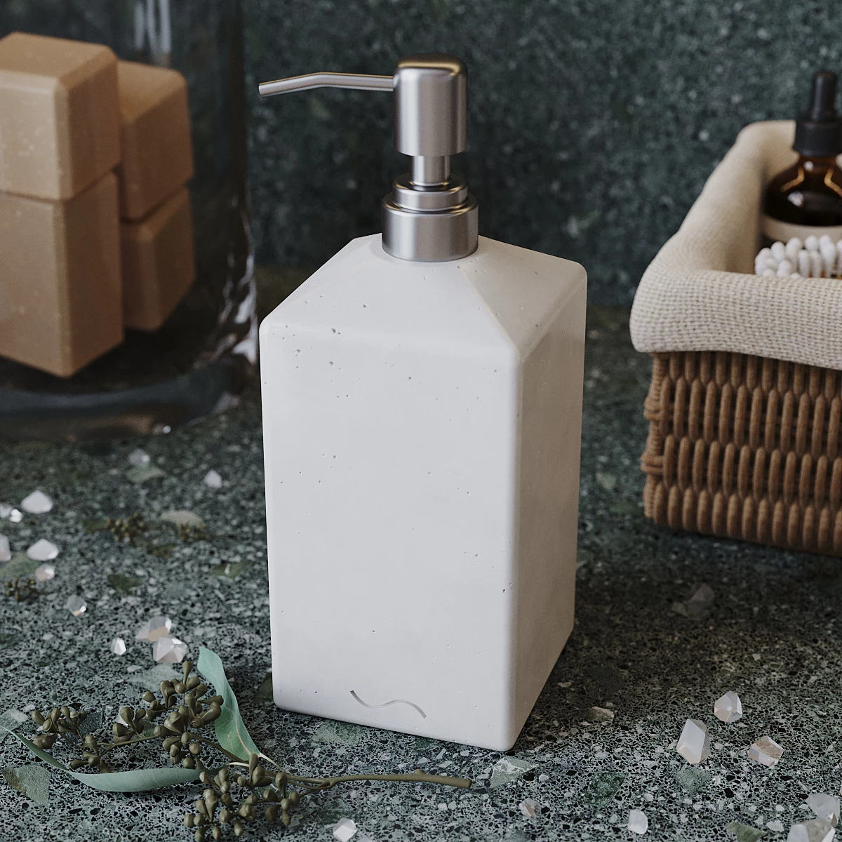 Дозатор Emily предназначен для жидкого мыла или моющих средств. Корпус дозатора изготовлен из декоративного бетона, а помпа - из металла.