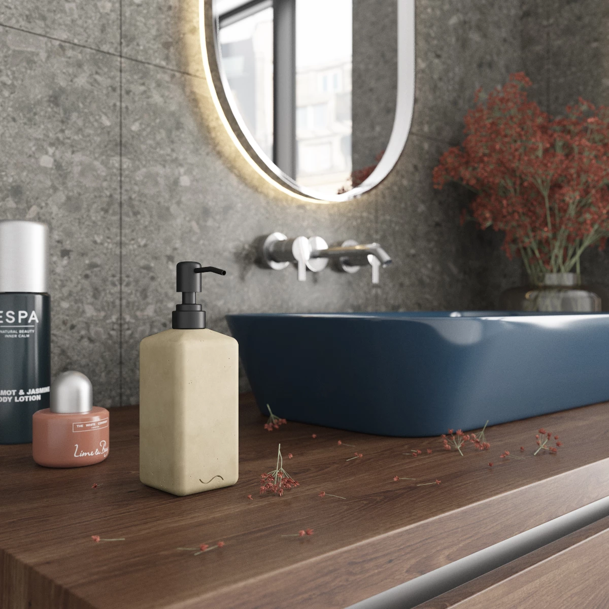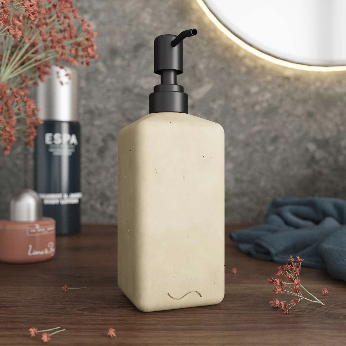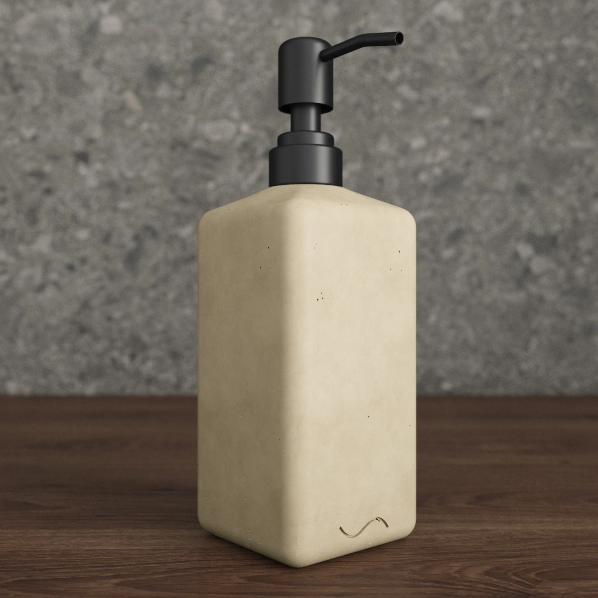 Корпус дозатора изготовлен из декоративного бетона, а помпа - из металла. Внутри дозатора находится емкость из прочного пластика.