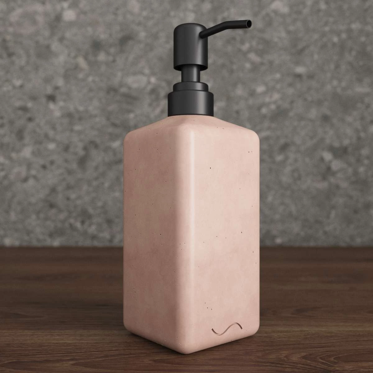 Корпус дозатора изготовлен из декоративного бетона, а помпа - из металла. Внутри дозатора находится емкость из прочного пластика.