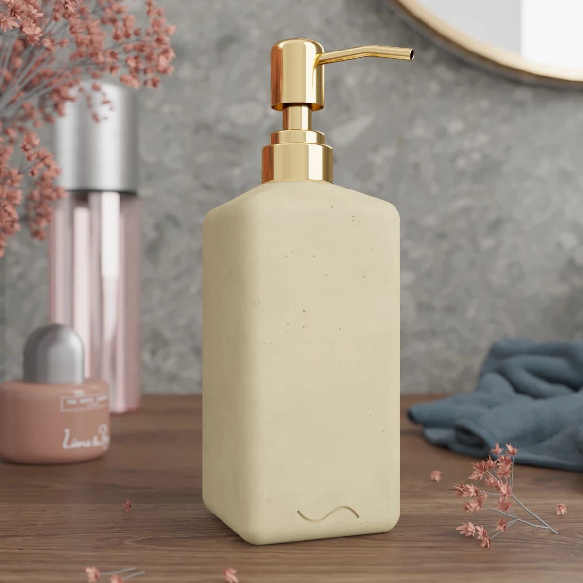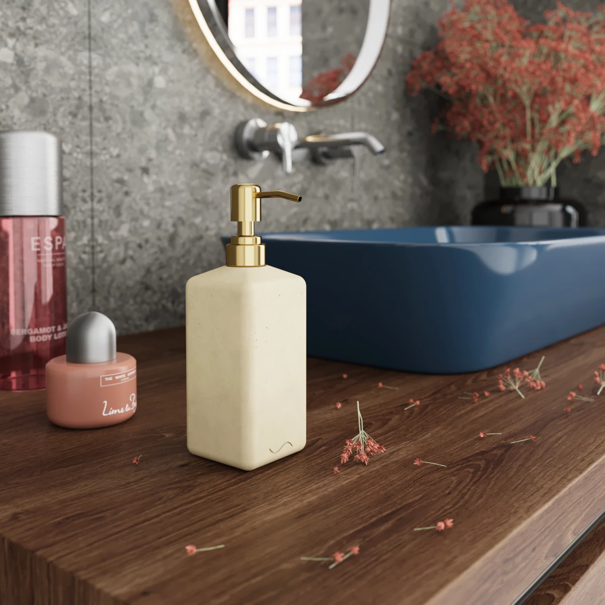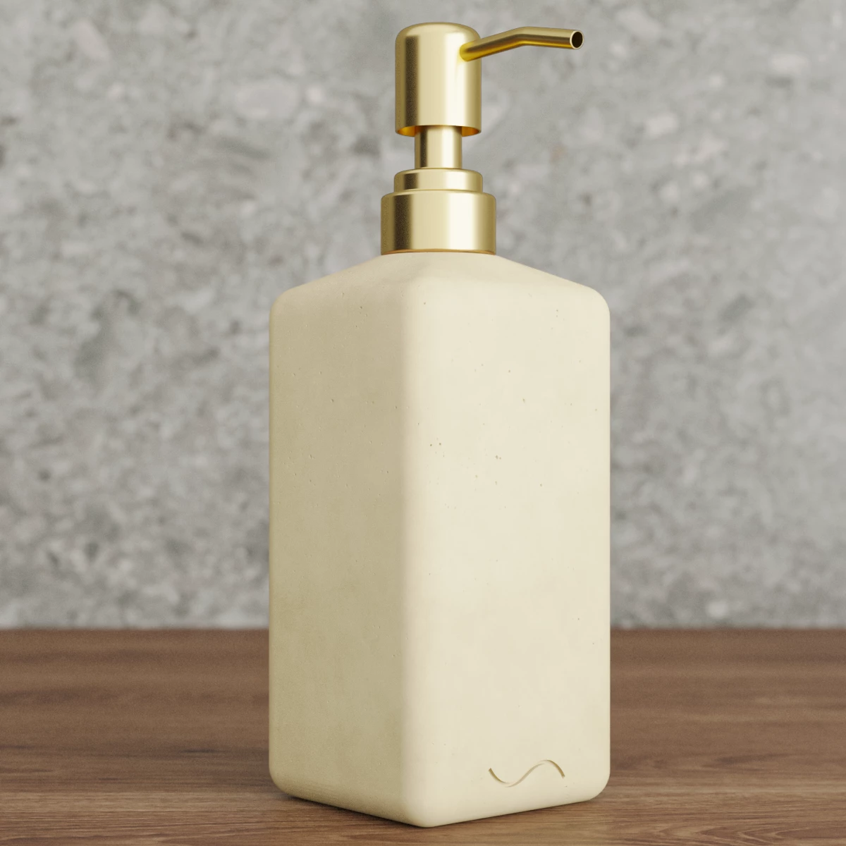 Корпус дозатора изготовлен из декоративного бетона, а помпа - из металла. Внутри дозатора находится емкость из прочного пластика.