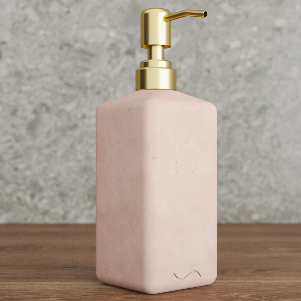 Корпус дозатора изготовлен из декоративного бетона, а помпа - из металла. Внутри дозатора находится емкость из прочного пластика.