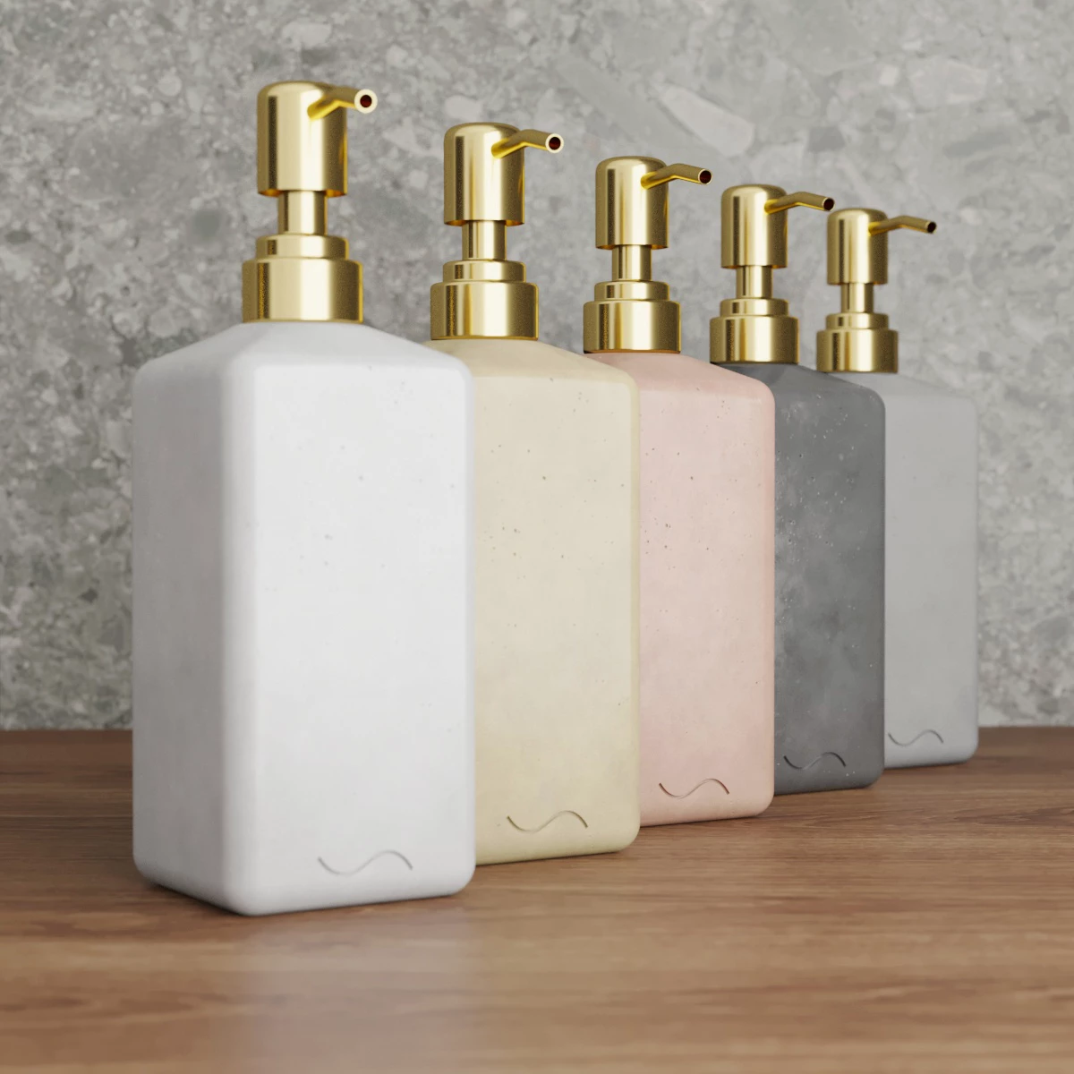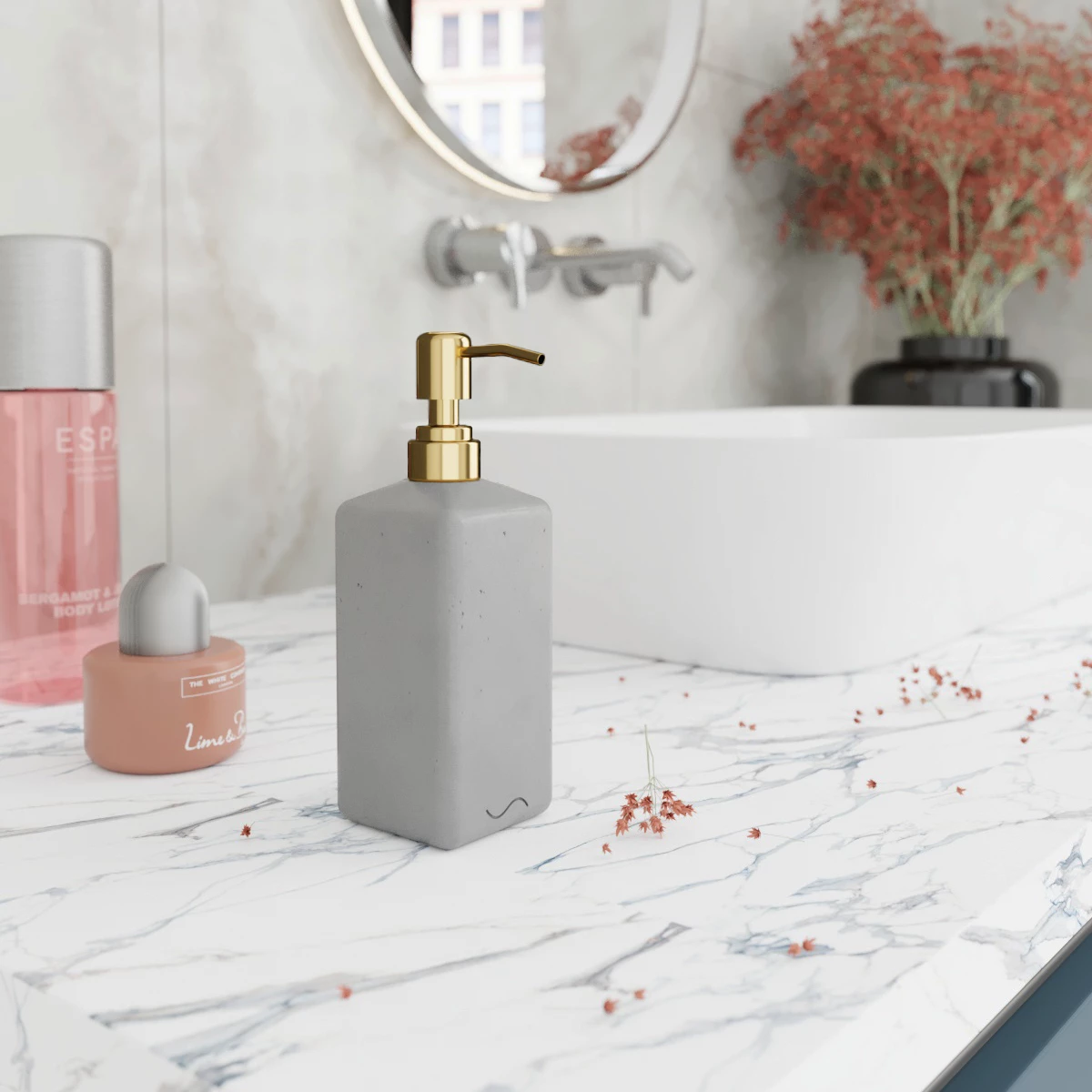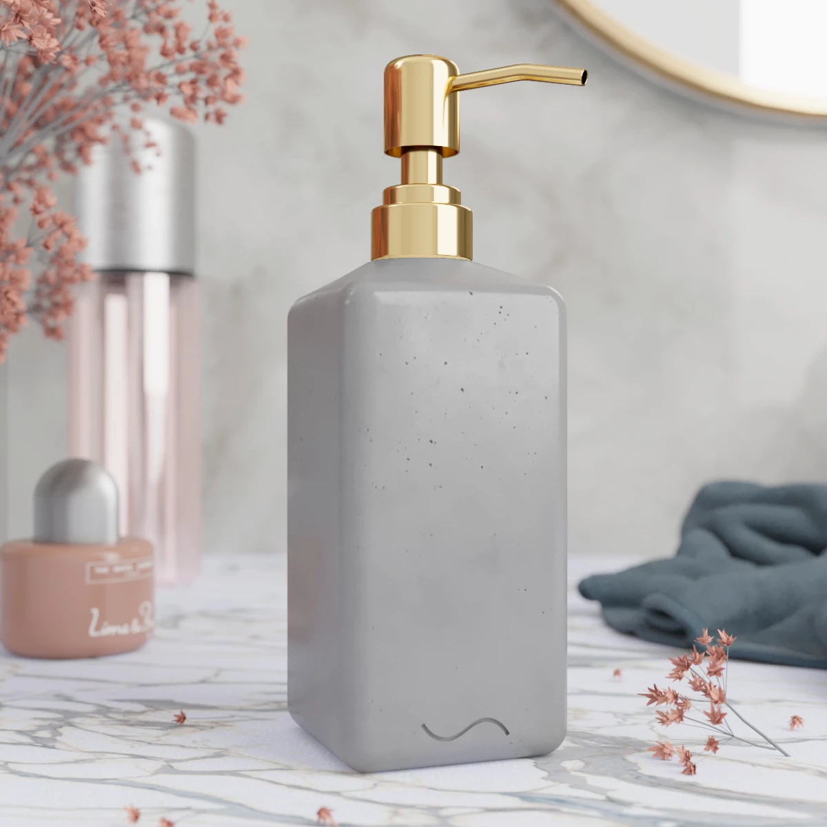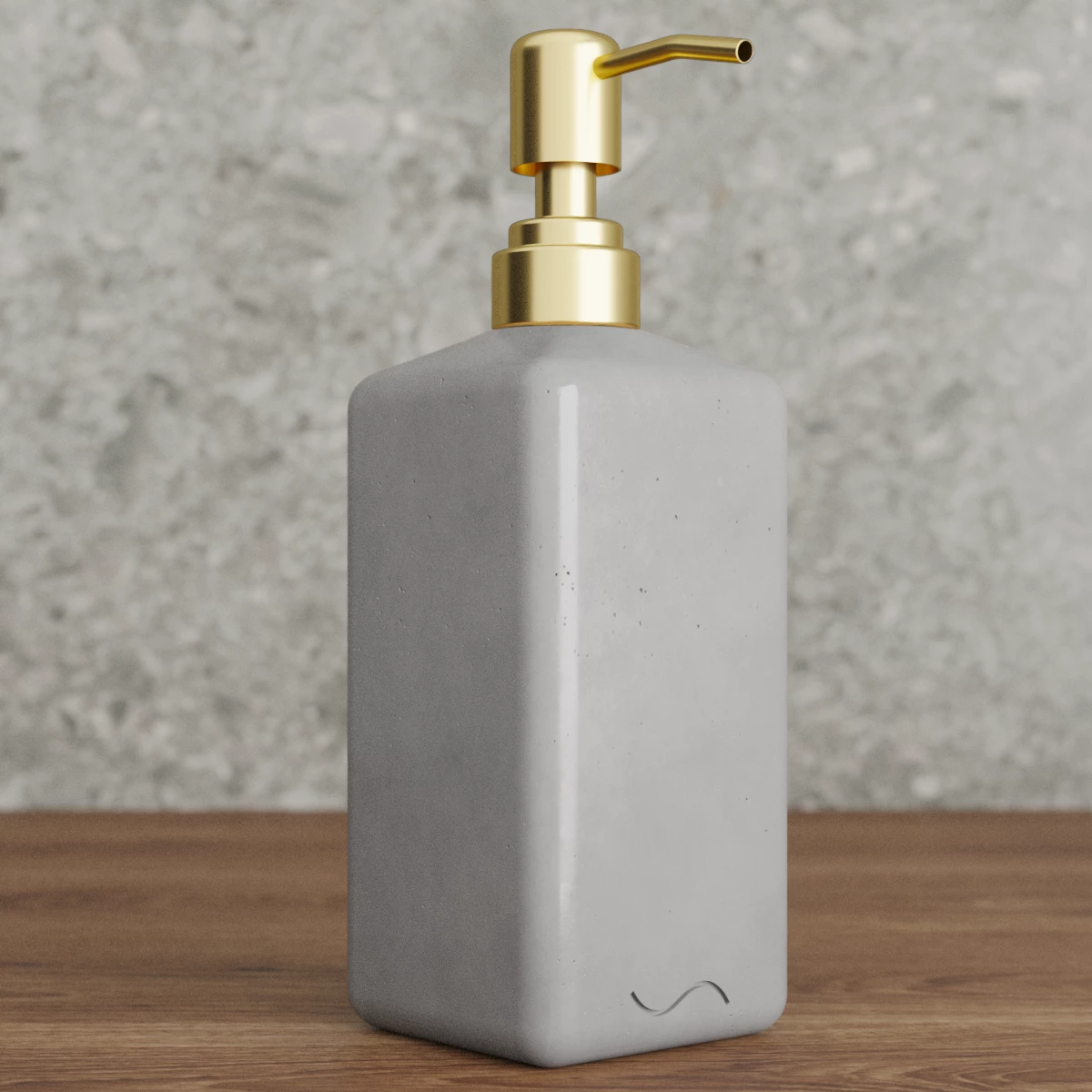 Корпус дозатора изготовлен из декоративного бетона, а помпа - из металла. Внутри дозатора находится емкость из прочного пластика.