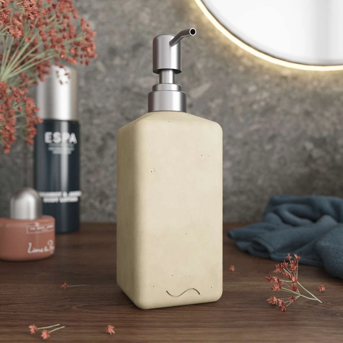 Корпус дозатора изготовлен из декоративного бетона, а помпа - из металла. Внутри дозатора находится емкость из прочного пластика.