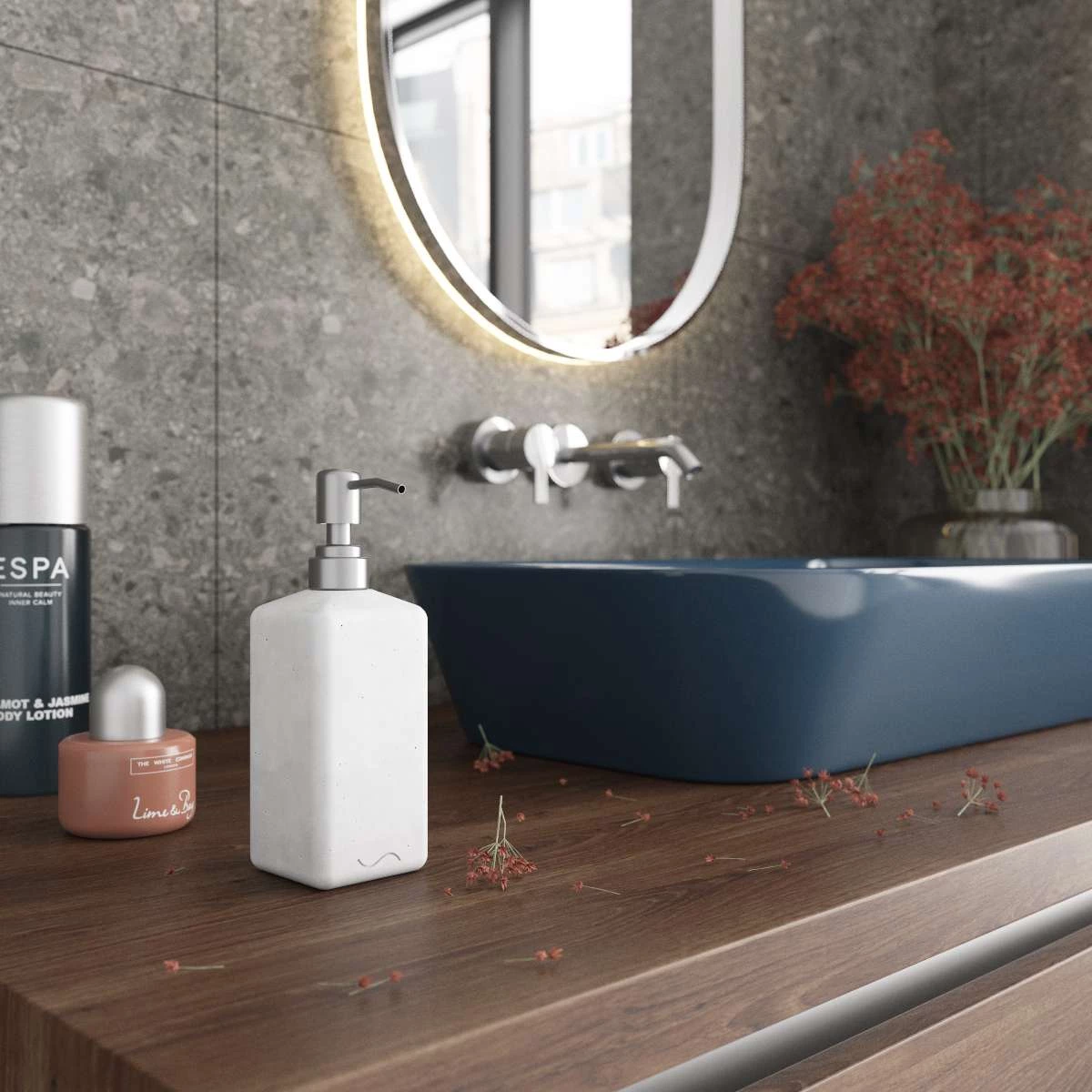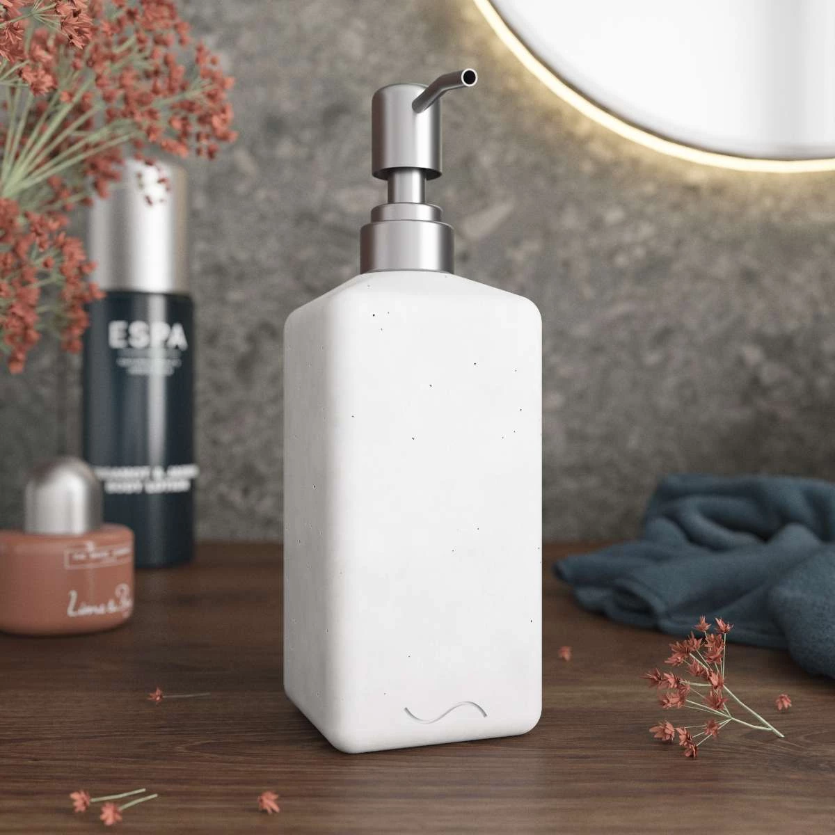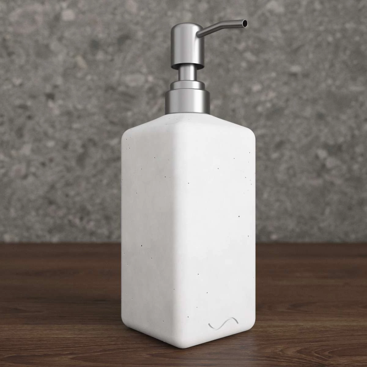 Корпус дозатора изготовлен из декоративного бетона, а помпа - из металла. Внутри дозатора находится емкость из прочного пластика.