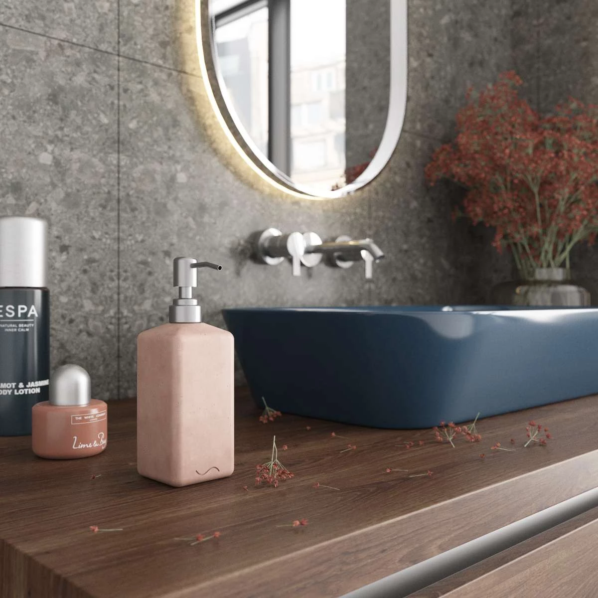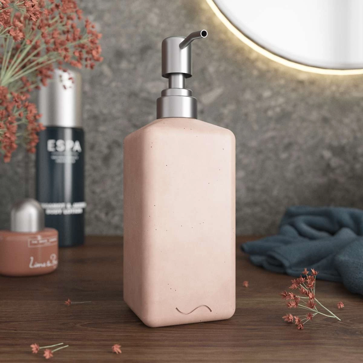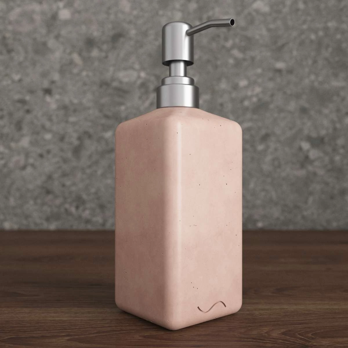 Корпус дозатора изготовлен из декоративного бетона, а помпа - из металла. Внутри дозатора находится емкость из прочного пластика.